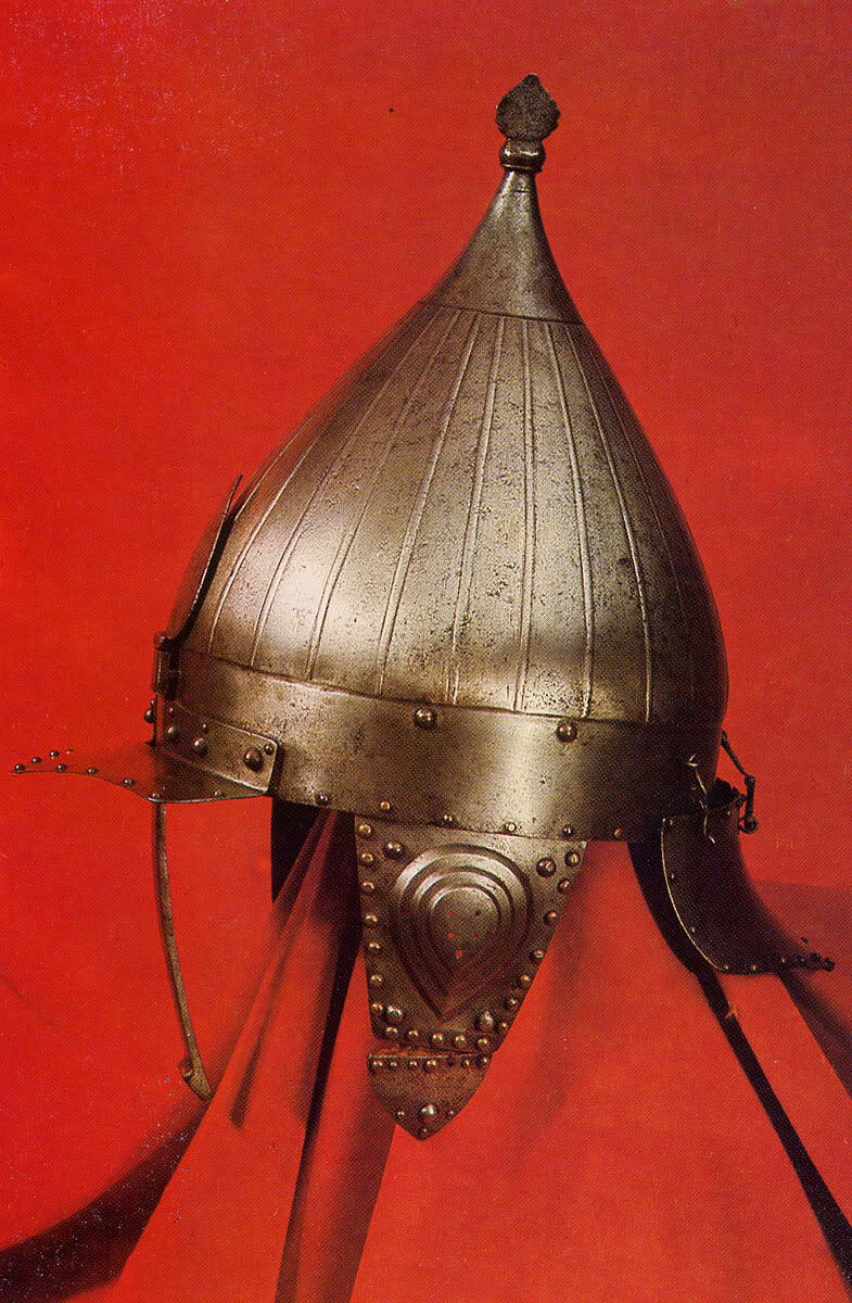 Шишак князя Федора Мстиславского. Оружейная палата Московского Кремля. Шлем турецкого происхождения, 16 век. Науши были добавлены реставраторами в 19 веке, они соответствуют шлему по периоду, но несколько ему велики.