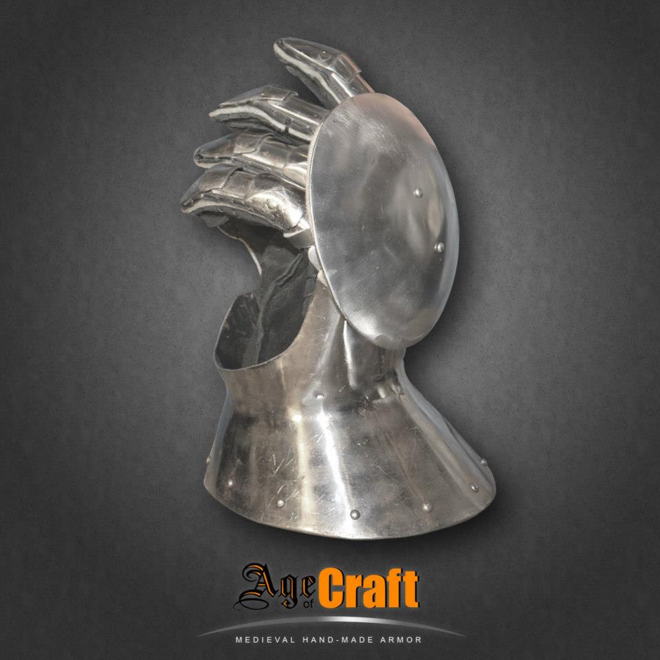 Шлема Саллет имеют много форм и разновидностей, применялись с середины 15 века рыцарями и пехотой. Представленный здесь шлем является рыцарским. Он дает максимальную защиту при относительно небльшом весе благодараря своей оптимальной форме. Его тулья формы повторяющей форму черепа, на лбу имеет дополнительное усиление с задней стороны установлен затыльник рачий хвост, предохраняющий от подлых ударов, широкое тяжелое забрало с ребрами жесткости способно защитить от очень тяжелых ударов, благодаря своему весу отлично держится в закрытом состоянии без дополнительной фиксации.