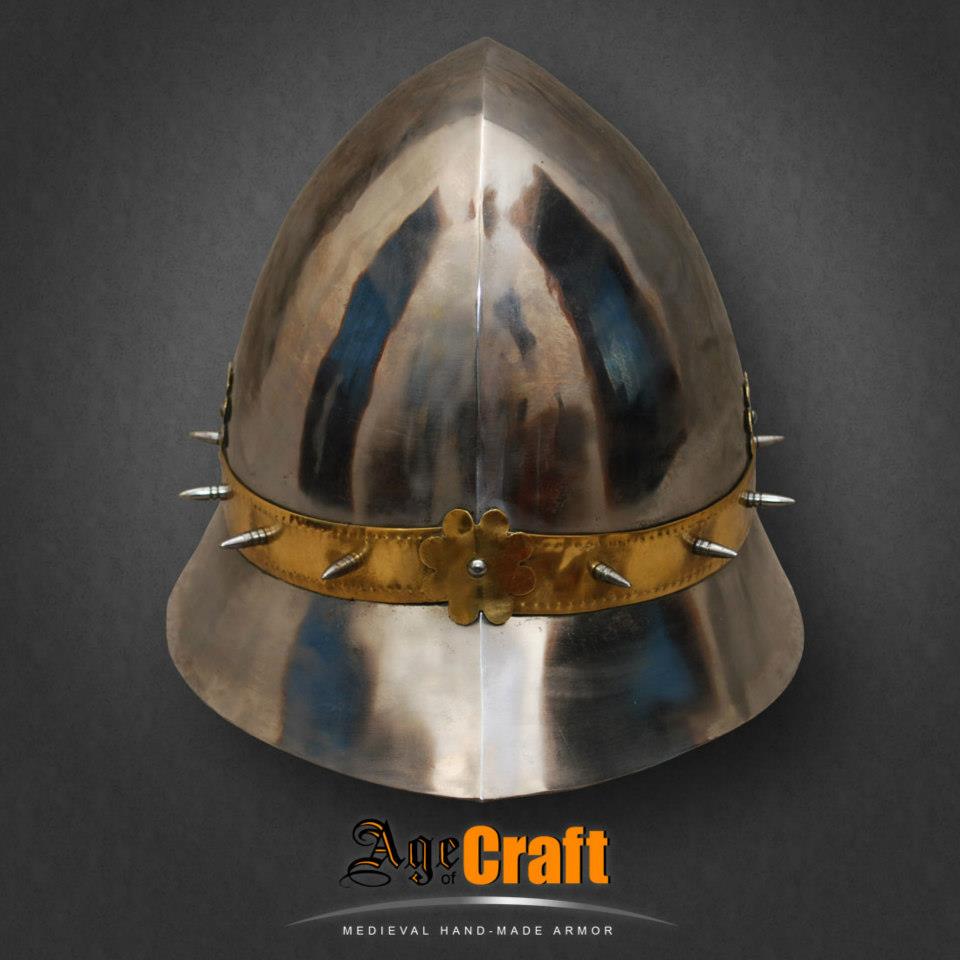 Очень изящный красивый и пропорциональный шлем для пехотинца, который кое чего добился в своей военной карьере. Кроме безукоризненой формы идеально приспособленой для отражения ударов (рациональный наклон частей тульи и полей) он украшен латунными накладками с чеканкой и шипами. Английские названия подобных шлемов вполне соответствуют его форме Кеттльхельм (kettle helmet) переводится как шляпа-шлем, а ироничное Kettle hat как шляпа чайник.