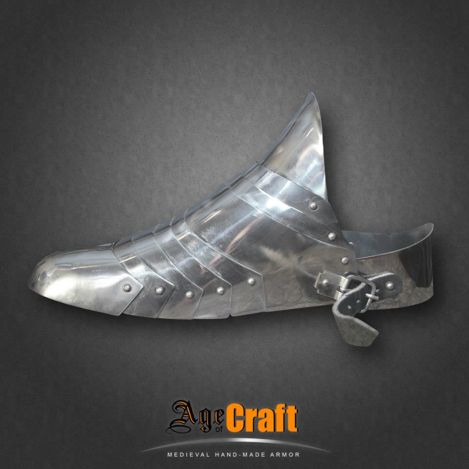 Пара саббатонов, то есть железных ботинок для защиты стопы от случайных и целенапрвленных ударов. Вместе с латной ногой дает полную рыцарскую броню для ног. Толщина металла 1 мм, в местах нахлеста, естественно получается 2 мм. Цена указана за пару и весит эта пара 700-900 грамм.