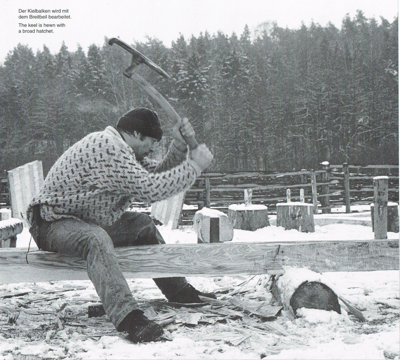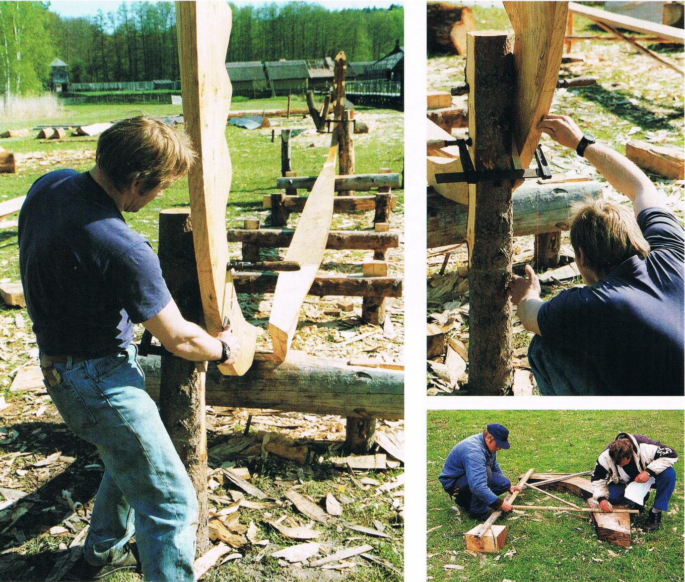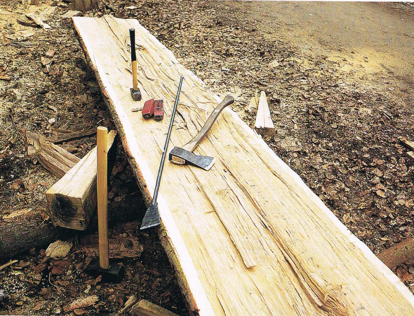 Реконструкция производилась вполне аутентично, по технологиям тех времён, с использованием аналогов старинных инструментов. Первым делом нужно клином расщепить ствол надвое:
