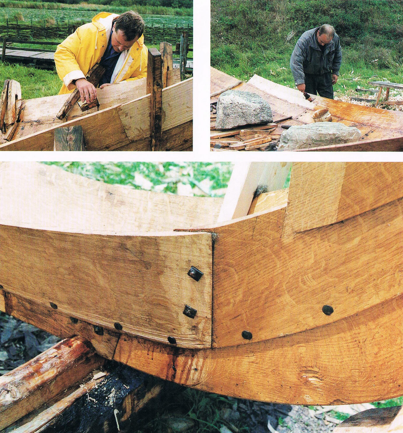 После чего смолой покрыли и сами доски. Тут ниже видны железные болты с гайками для временной фиксации деталей ладьи. Позже они были заменены на деревянные нагели.