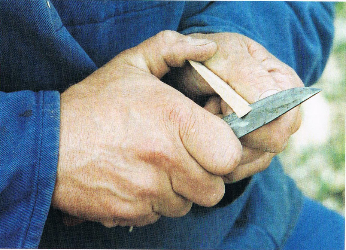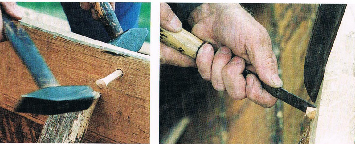 Деревянные нагели имеют свои преимущества перед железными гвоздями: разбухнув – они только прочнее держатся за древесину. Тогда как железный гвоздь деформирует отверстие в которое забит, ржавеет и может со времнем выскользнуть. Но естественно железные гвозди прочнее, поэтому их требуется меньше, а для каждого дюбеля отверстие необходимо сначала сверлить. Ниже показано вырезание нагелей.