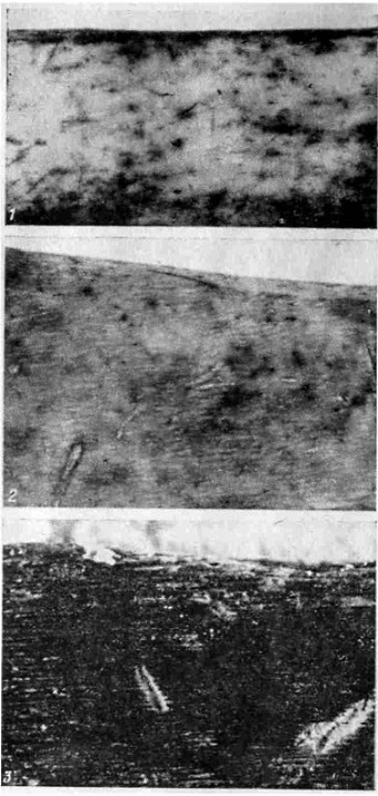 Мы располагаем данными, которые позволяют говорить и о других инструментах, применяемых в косторезном деле. В частности, встречаются следы распиловки кости и особенно рога (рис. 9, 1-3). Для этого применялась металлическая мелкозубая пила с шириной полотна в пределах от 1,5-2 до 5 мм. За один ход срезали слой кости в 0,1-0,3 мм, рога – 0,3-0,5 мм (рис. 9, 4). Края распила прямые. Все это говорит об острых, с некоторым разводом, зубьях и достаточно высокой сталистости металла. Нила как инструмент костореза была хорошо известна как русским ремесленникам, так и алано-болгарским.