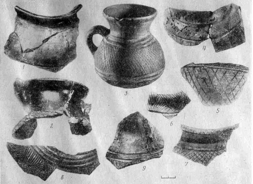 | Рис. 3. Образцы керамики со следами работы лощил 1, 2 – сплошное лощение, 3-7 – орнамент, выполненный лощилами типа II, 8, 9 – рельефный орнамент, выполненный лощилами типа III |