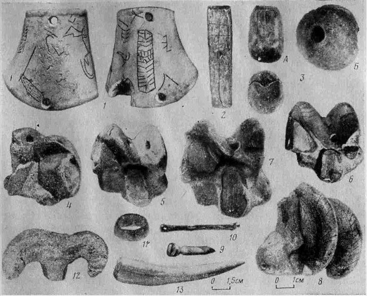 VII. Скульптура (рис. 5, 12). Заготовкой послужил астрагал крупного животного. Впачале астрагал был просверлен (диаметр отверстия – 6 мм), далее топором рассечен по продольной линии на две равные части. Отверстие, видимо, должно было нарушить целостность кости и облегчить расчленение ее на две части. Затем ударами острым предметом были сделаны углубления, в результате чего выделились конечности и голова лошади. В таком состоянии, со следами грубых сколов, в явно незаконченном виде, она дошла до нас.