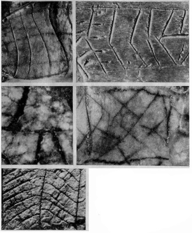 | Рис. 8. Макросъемка деталей рисунков на кости. 7, 2 – техника холодного прочерчивания, 3, 4 – техника горячего прочерчивания, 5 – фрагмент рисунка на таранной кости (увел.,в 10 раз) |