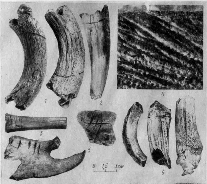 | Рис. 9. Обработка кости различными инструментами. 1–3 – следы распиловки рога и кости, 4 – микросъемка торцевой стороны распила (увел, в 10 раз), 5, 6 – следы рубки кости топором |