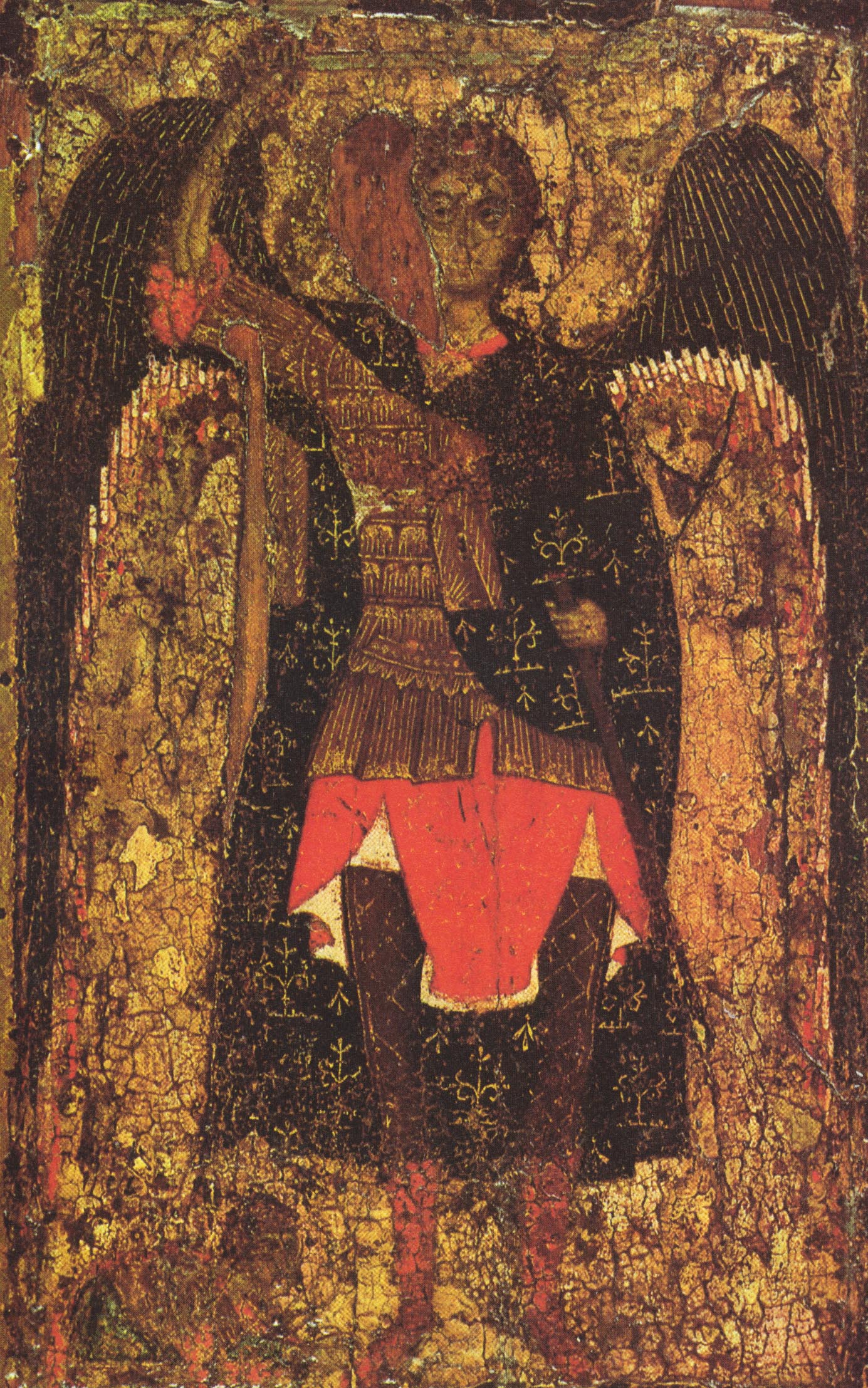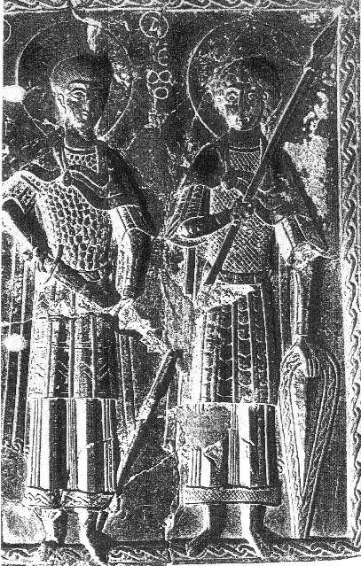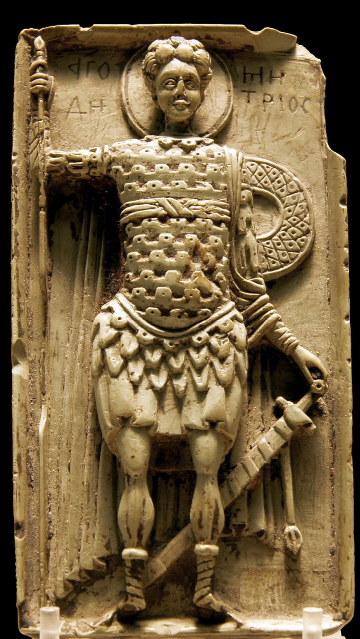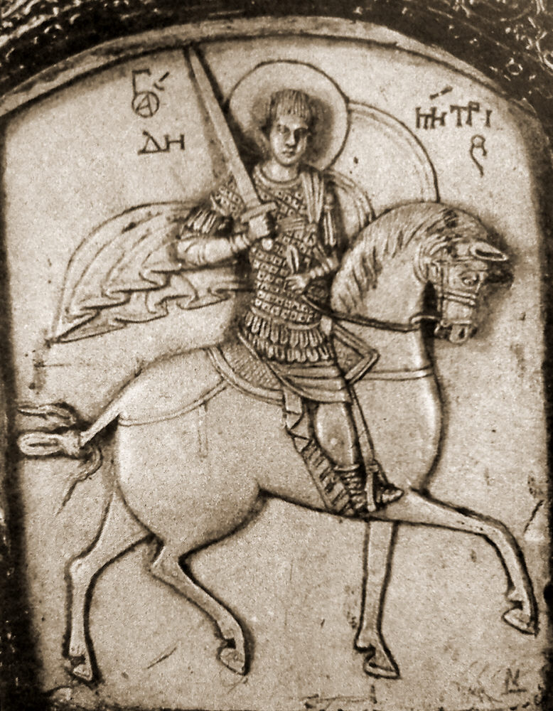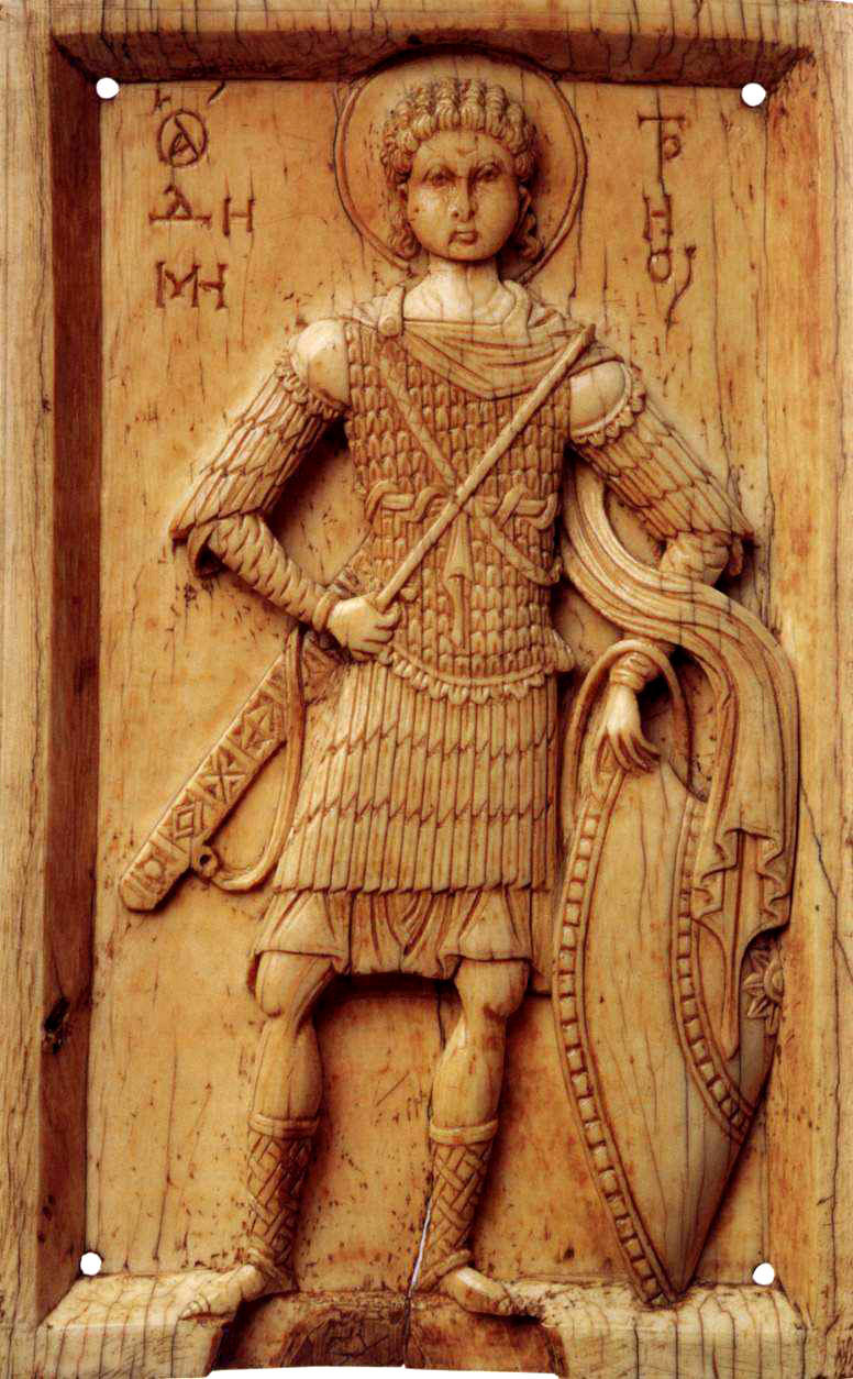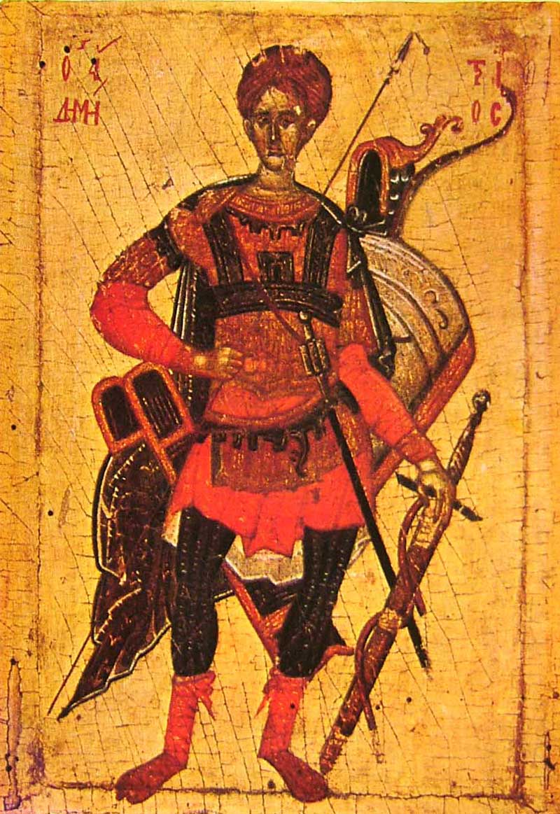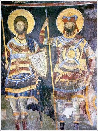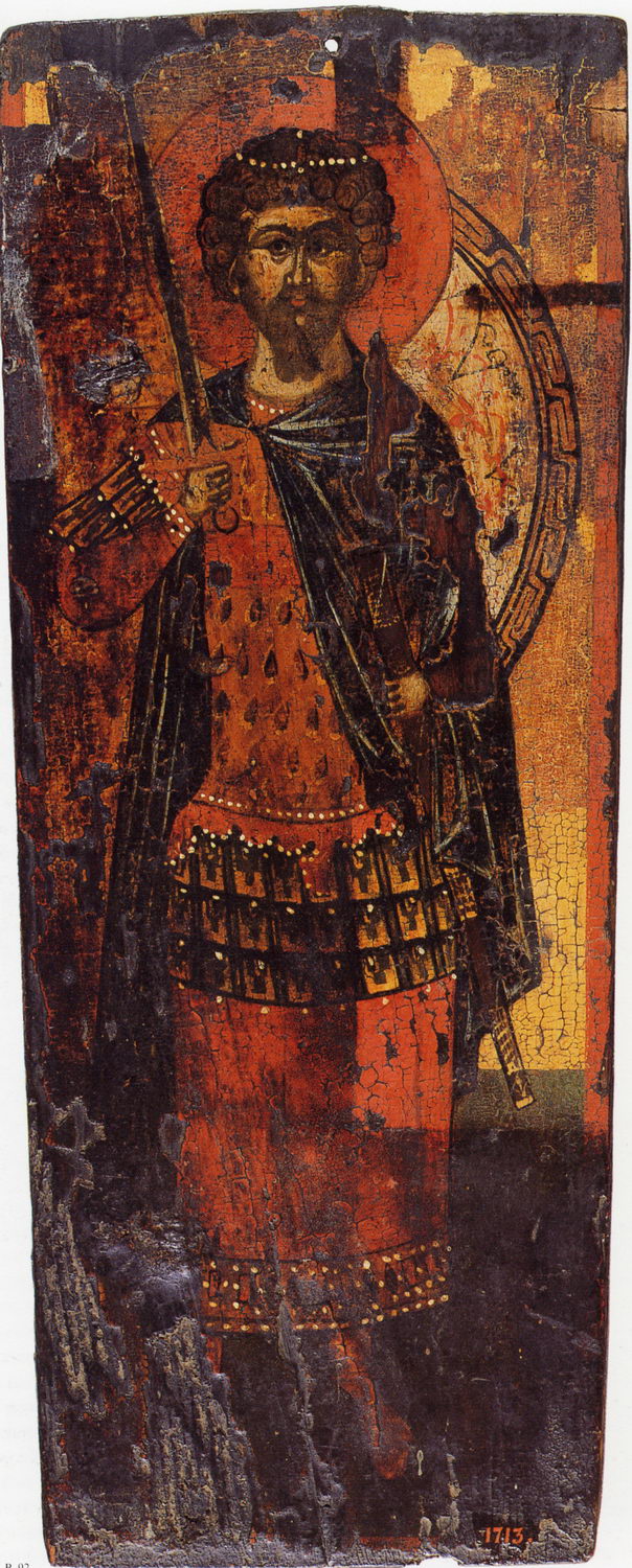 | Федор Тирон, икона 13 века, Патмос. Интресен ростовой, выгнутый кавалерийский щит. | Святой Меркурий. Фреска. Церковь в Охрид 1295 год. Сербия. | Стеатитовая икона св. Димитрия. 12 век. Нынешнее местонахождение: Москва, Кремль. |