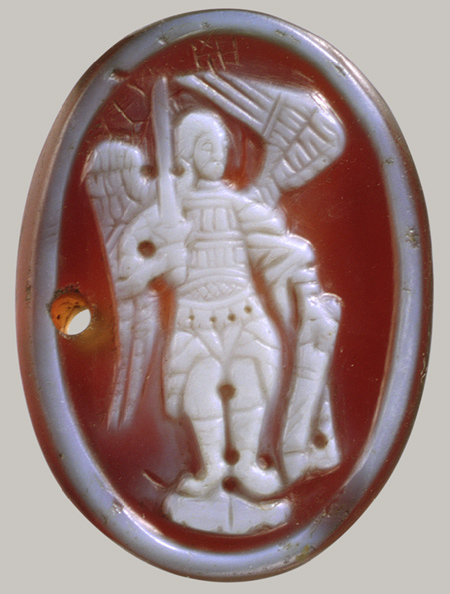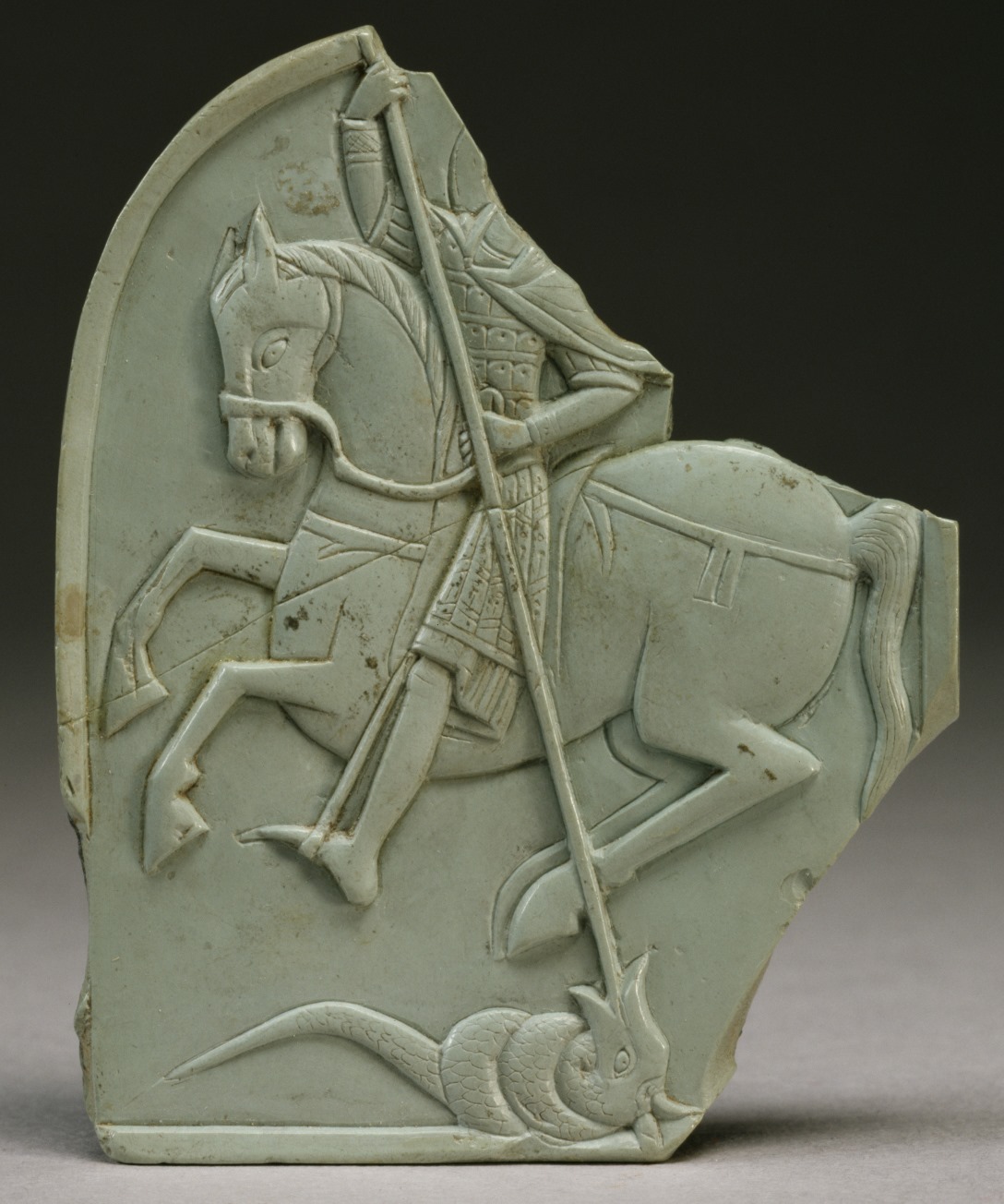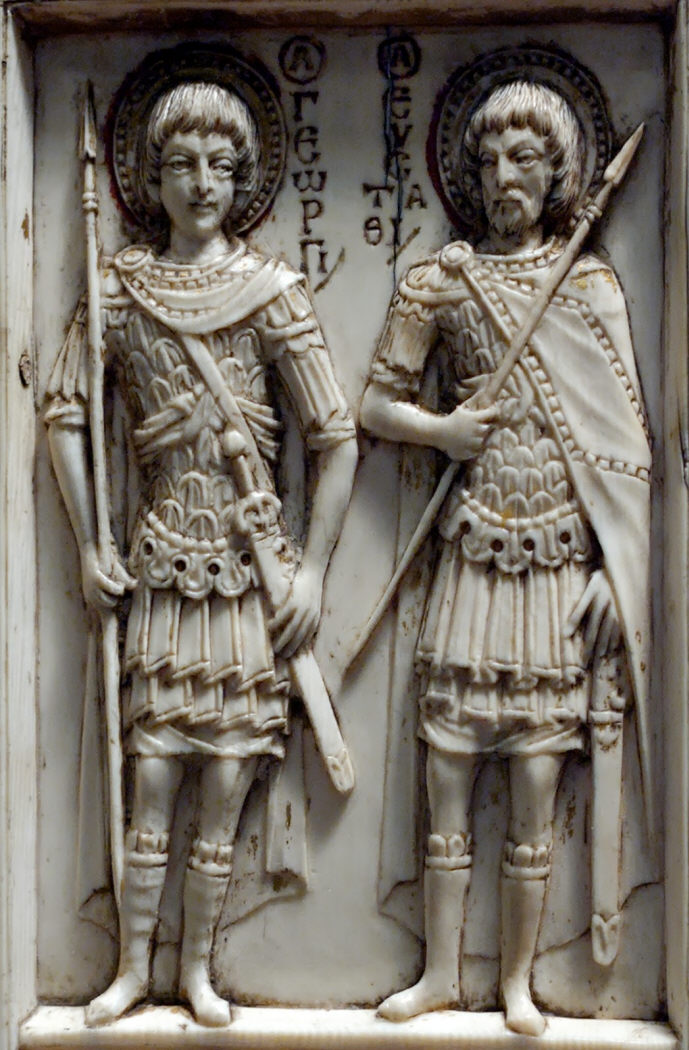 | Поврежденная стеатитовая икона Св. Георгия. 12 век. Местонахождение: Музей Метрополитен. Нью Йорк. | Христос благославляет венцами меченичества св. воинов Феодора Стратилата, Георгия Победоносца, Димитрия Солунского; Византия; XII в.; местонахождение: Украина, Севастополь, Херсонесский музей-заповедник. | Центурион из церкви Панагия Мавриотисса, Кастория, Греция, 1260. |