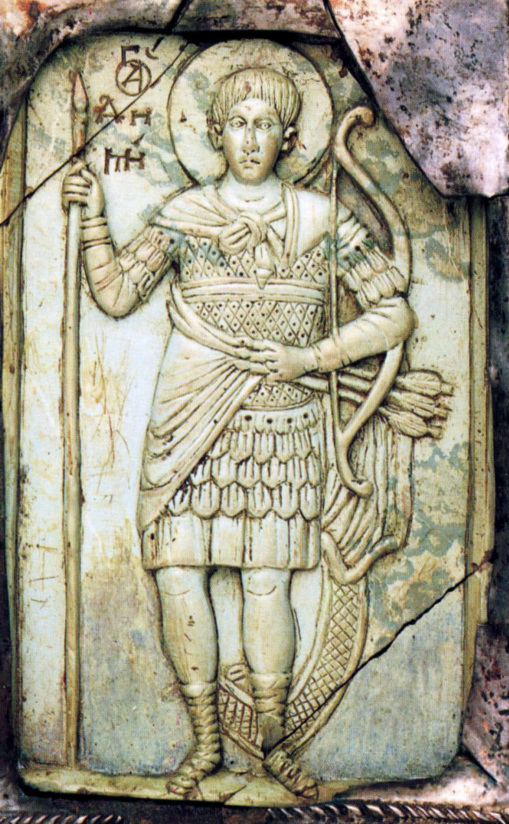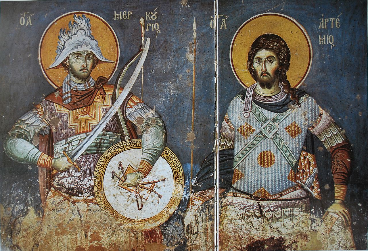 | Святые Меркурий и Артемий Антиохийский. Фреска Мануила Панселина. Афон. Карея. Протат 1290-1310. Он держит меч, лук и щит. Голова святого увенчана "скифским" шлемом, который отражает место жизни святого. Короткая борода святого показывает его молодость, а богатая одежда – его высокую должность. Символами святого стали шлем, щит и меч Лицо Артемия имеет явное сходство с ликом Христа. |