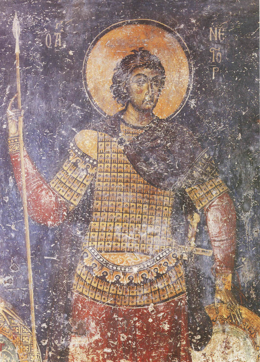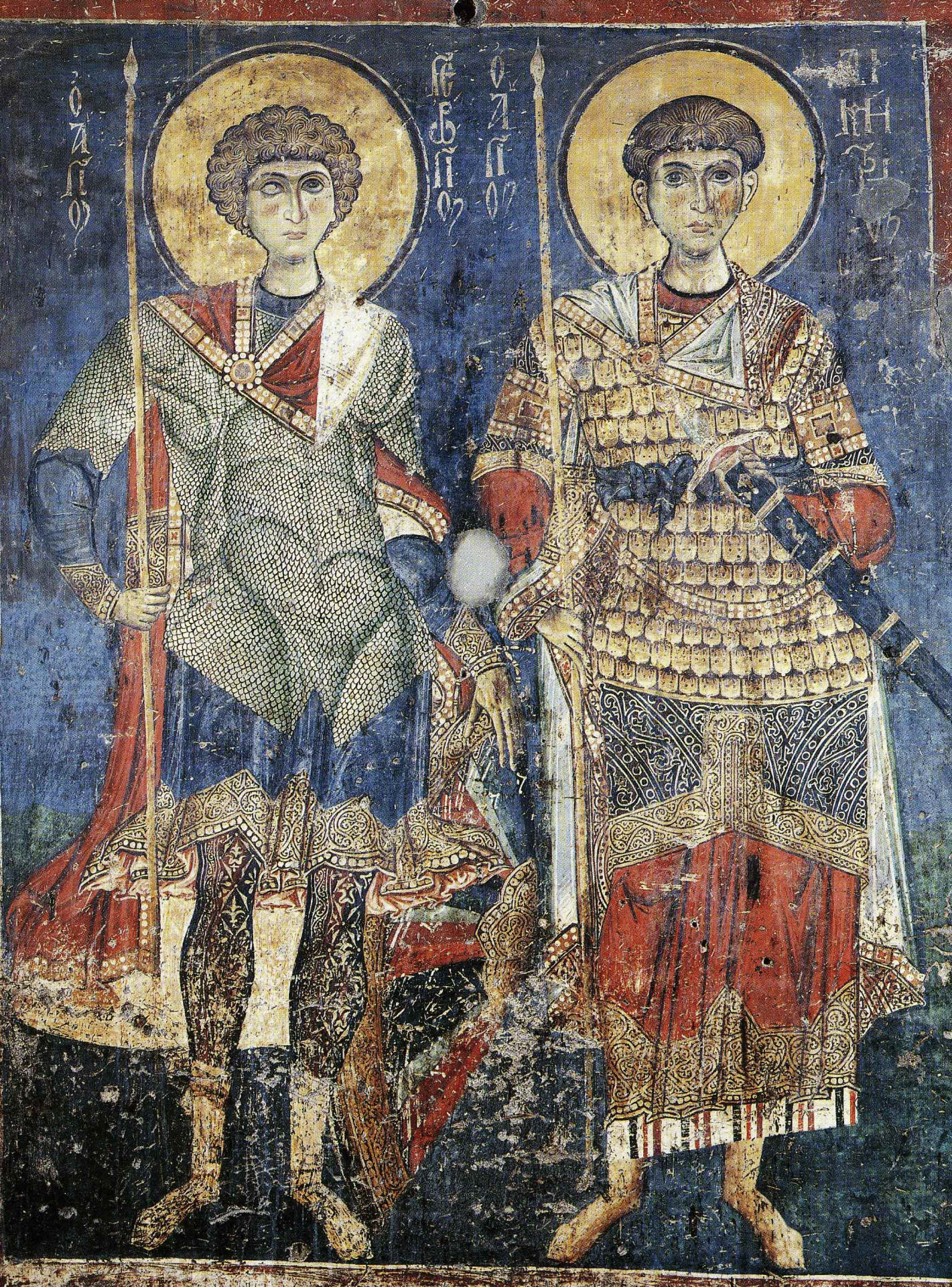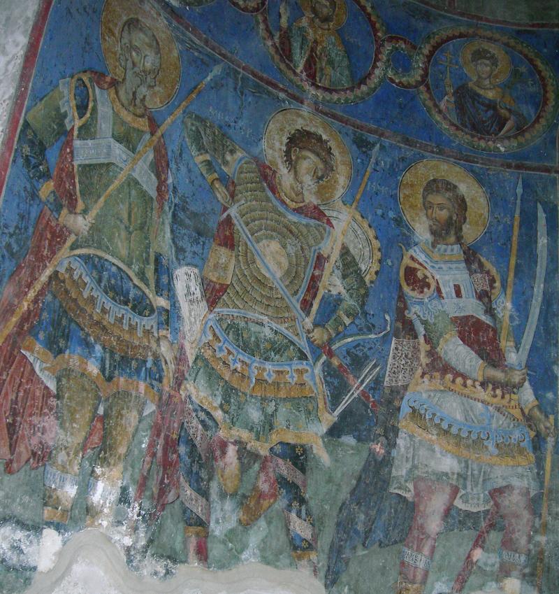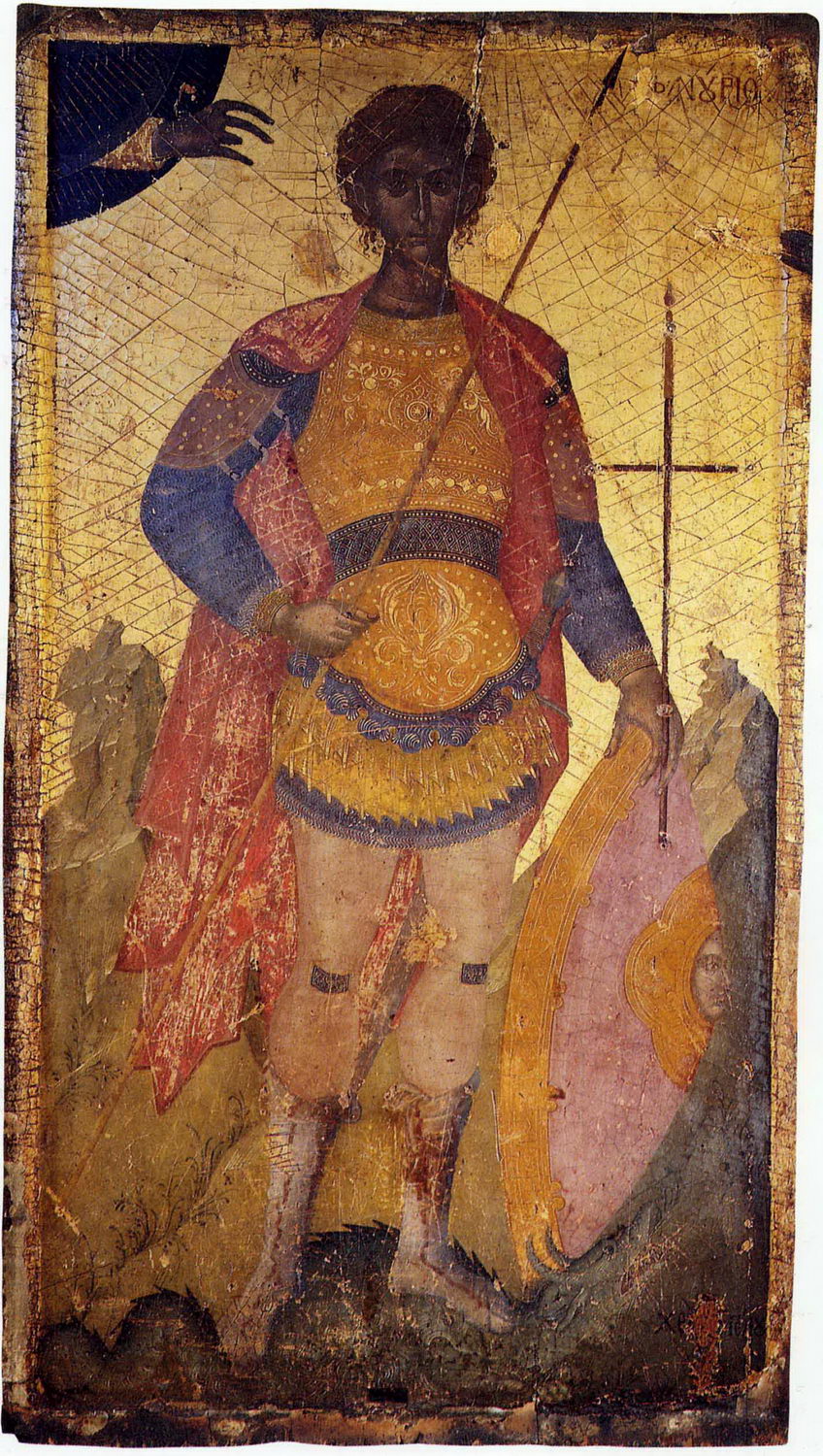 | Святой Георгий и святой Деметрий, настенная фреска. Кольчуга Георгия изображена на подобие "мускульного панциря" античности. circa 1180, Кастория, Греция, church of Agioi Anargyroi. | Св. Нестор. Фреска. Греция (Кастория). 1160-1180-е гг. | Икона Св. Георгия. изображающая сцены из его жития и мученичества. P First half of the 13th century. |