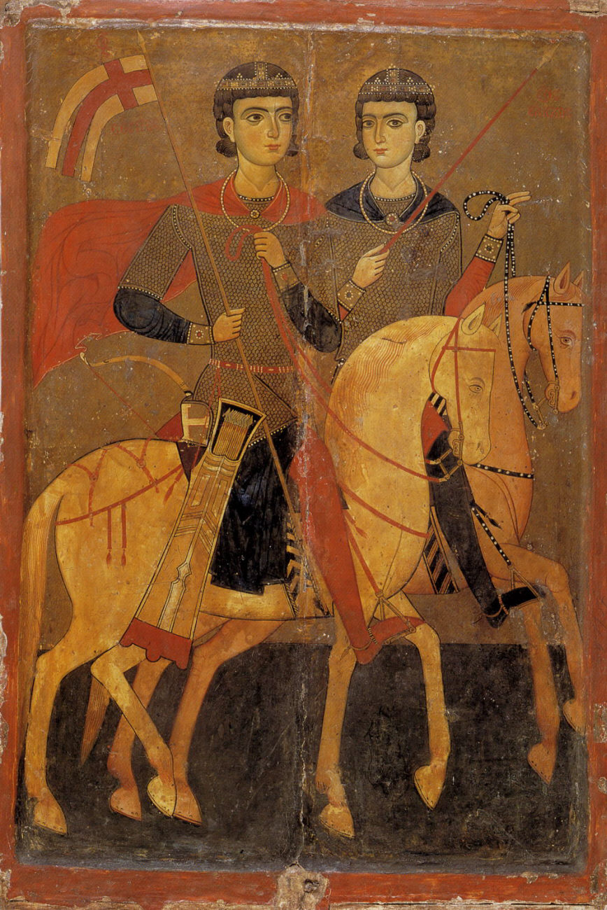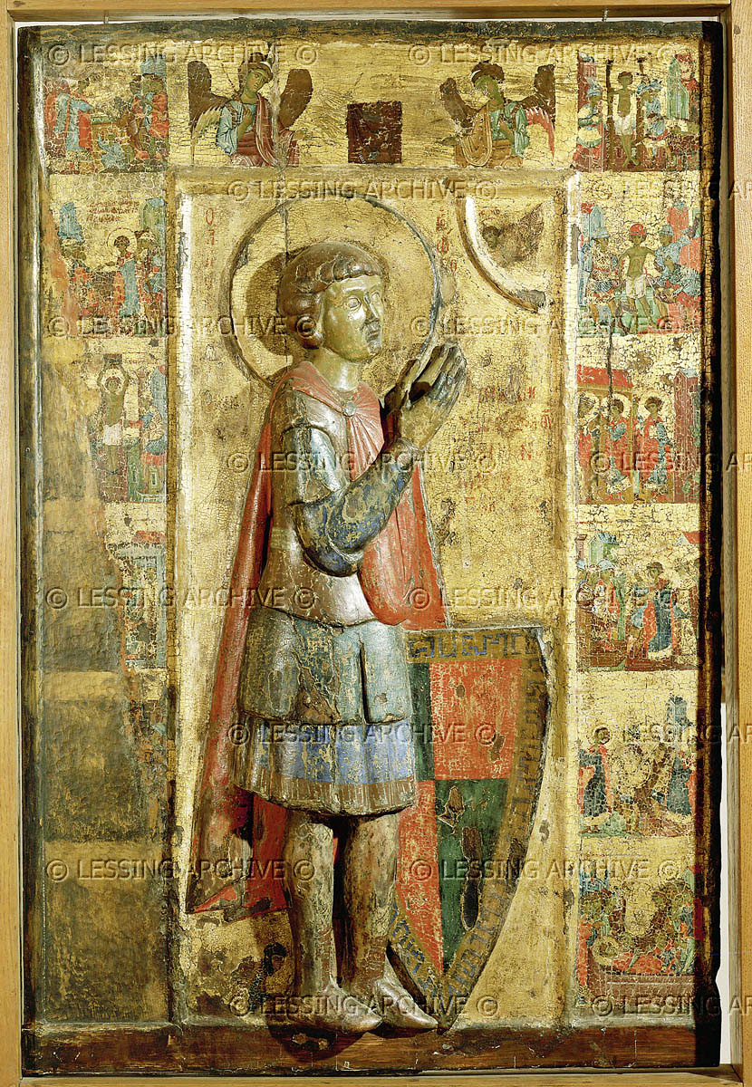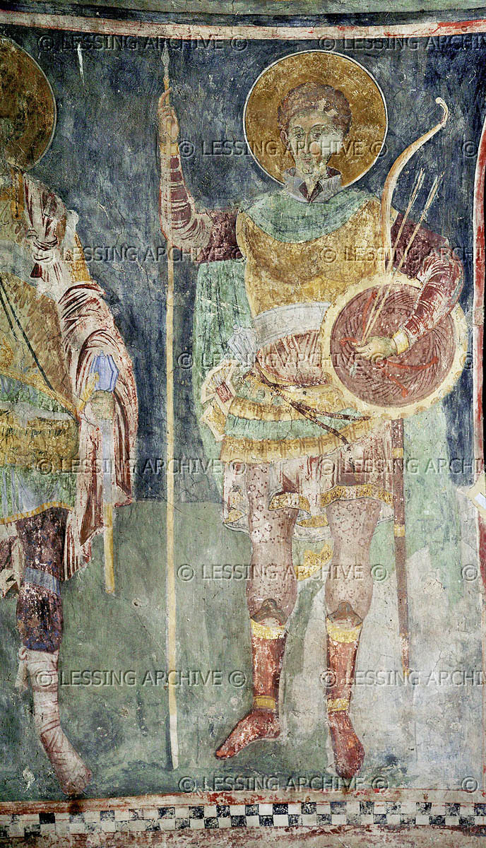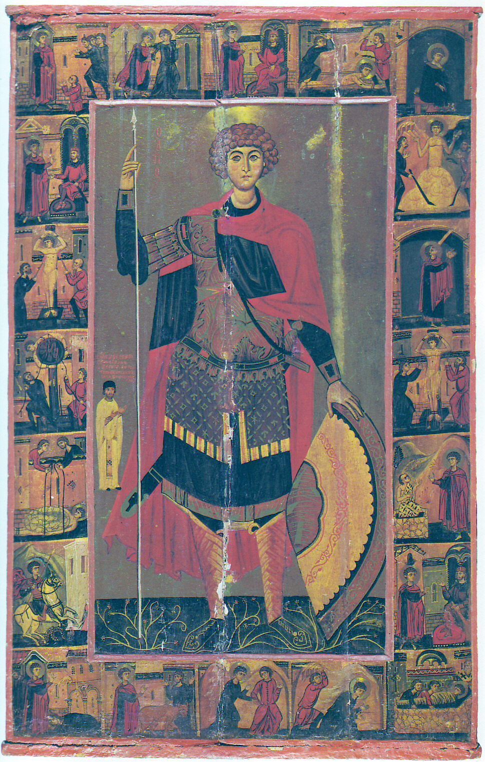 | Святой Георгий и святой Деметрий, настенная фреска. Кольчуга Георгия изображена на подобие "мускульного панциря" античности. circa 1180, Кастория, Греция, church of Agioi Anargyroi. | Св. Нестор. Фреска. Греция (Кастория). 1160-1180-е гг. | Икона Св. Георгия. изображающая сцены из его жития и мученичества. P First half of the 13th century. |