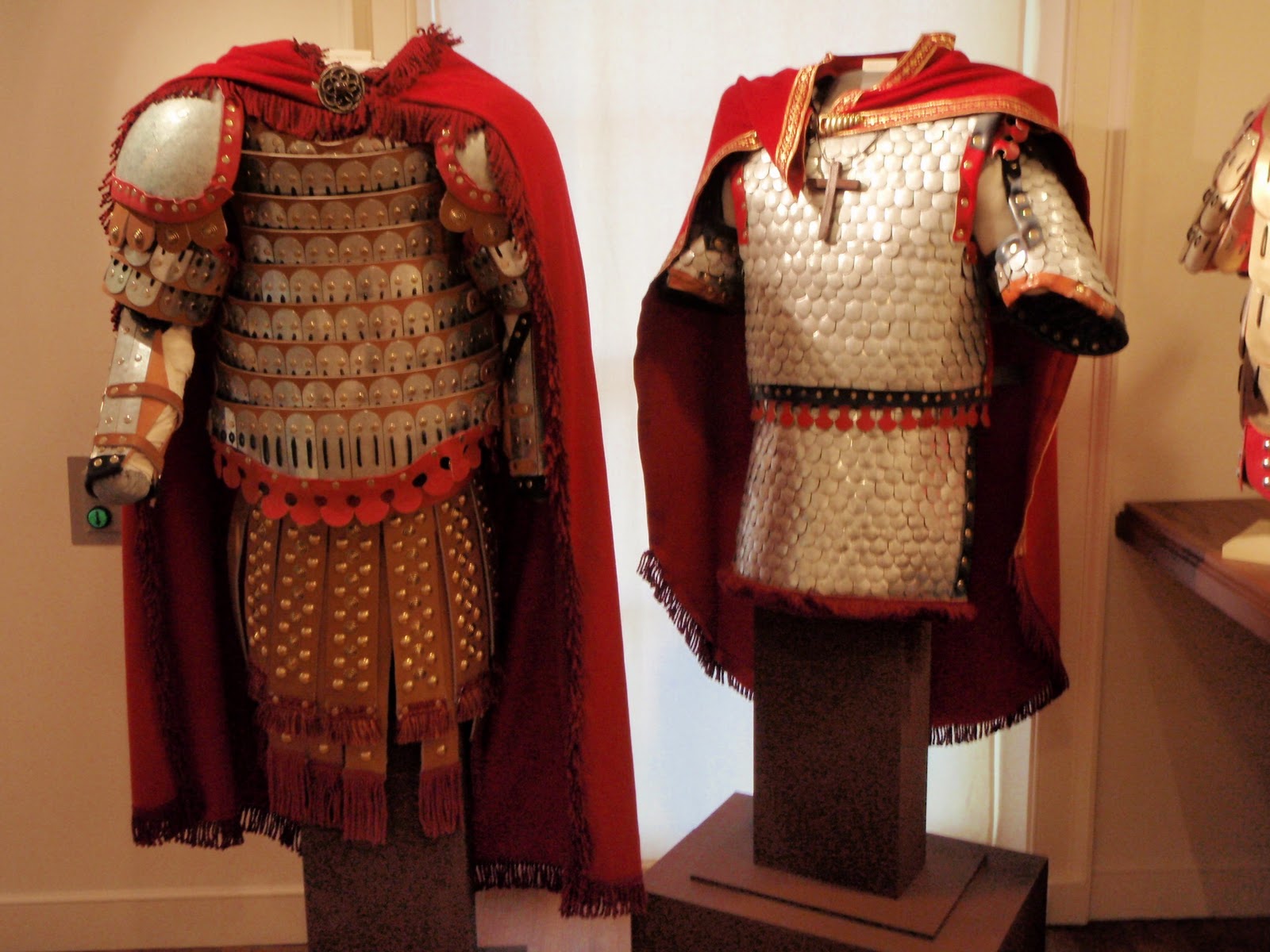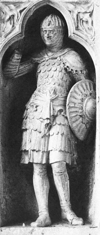 | Святые мученики Сергий и Вакх. Снаряжение коней европейского стиля, на флаге и спинке седла присутсвует католический крест. Византия. XIII век. Египет, монастырь св. Екатерины на Синае. | Св. Прокопий. Створка диптиха. Вторая половина XIII века. Очень детально изображена богатая одежда воина. Доспех представляет из себя просеганный жилет с мягким наполнителем под котрый одета кольчуга. | Византийский воин. Реймский собор, Франция сер. 13 ст. Кроме детального чешуйчатого и кольчужного доспехов поддоспешной одежды и наплечников, внимание привлекает детпльное изображение прутяного, усиленного металлическими полосами и умбоном щита. |