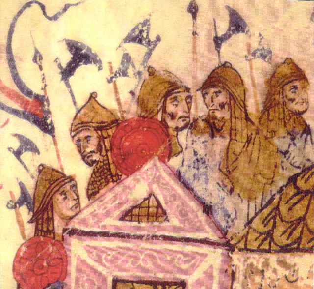 | Иллюстрации датированные 13в., из экземпляра Арабской Хроники Иоанна Скилицы (Arabs Chronikon of Ioannis Skylitzes) в национальной библиотеке в Мадриде. Видны детали доспехов. Что интересно, черепица крыш зданий и чешуя доспехов нарисованы очень похожим орнаментом. Слева битва у реки Лалакон (Battle of Lalakaon), справа мятеж варяжской гвардии, иллюстрация полностью |
