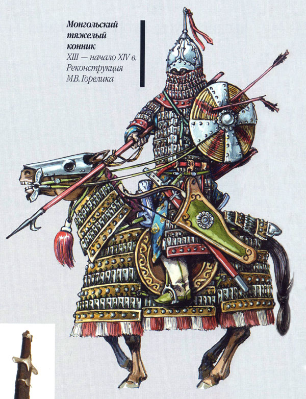 Монгольский тяжеловооруженный всадник, рисунок М.В. ГореликаМонгольский тяжеловооруженный всадник, рисунок М.В. ГореликаШлем предназначался для защиты головы воина и прикрывал, как минимум, ее лобнозатылочную часть и, как максимум, всю голову. Для последней цели чаще всего служила бармица – лист металла или кожи, оборачиваемый вокруг шлема и прикрепляемый к нему через отверстия в тулье или обруче. При минимальной защите бармица оставляла открытыми лицо и горло, а при максимальной – только глаза.