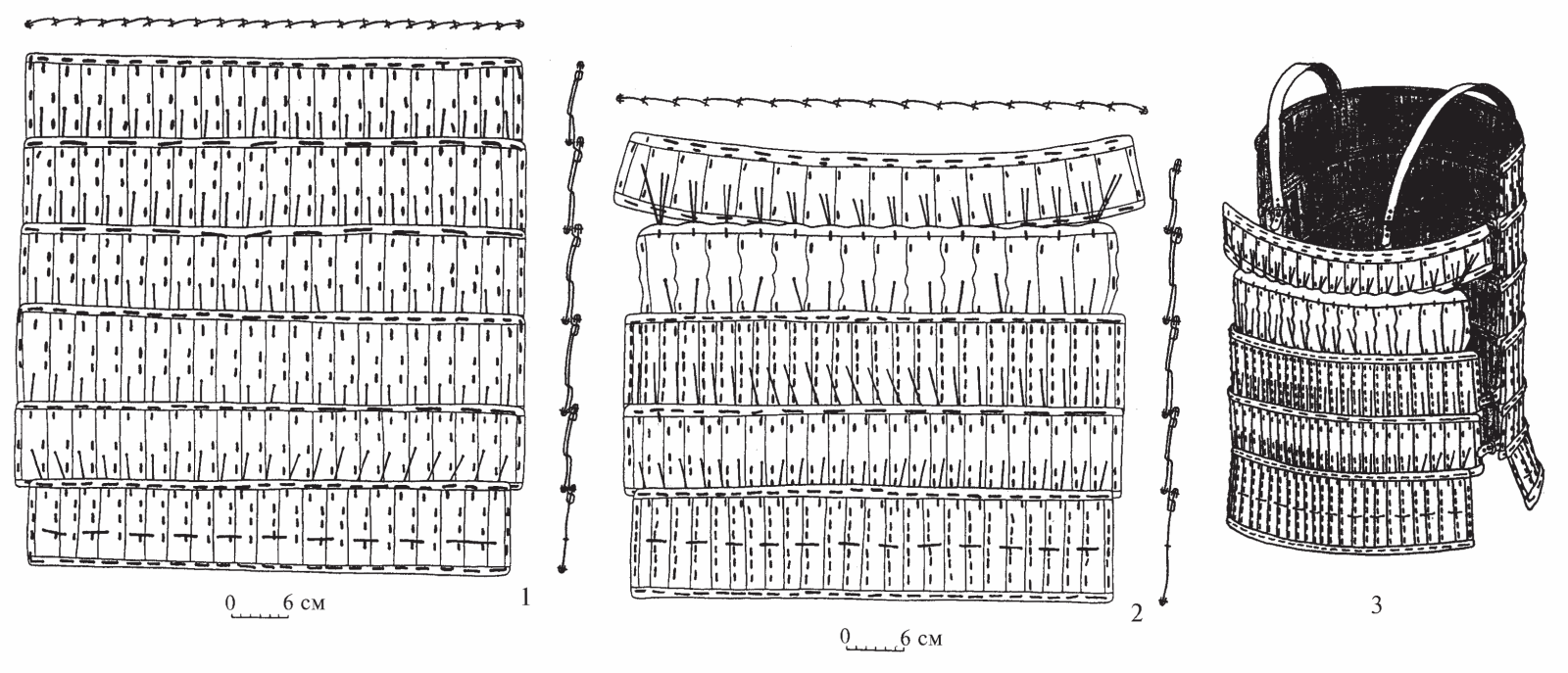 Сохранившиеся на пластинах кожаные детали и положение пластин в могиле (полосы сложенные друг на друга) позволяют уверенно реконструировать способ сборки доспеха и его покрой (рис. 8). Пластины, длинной стороной направленные по вертикали, набирались в горизонтальную полосу путем наложения одной на другую (принцип «черепицы»). Они плотно связывались между собой отдельными короткими ремешками через каждые две совмещенные пары боковых отверстий соседних пластин. На внутренней стороне такие ремешки, видимо, сшивались, так как следов их завязывания не зафиксировано. У наспинника левая пластина перекрывала правую, у нагрудника, наоборот, – правая перекрывала левую. Ширина наложения пластин составляла 8-12 мм.