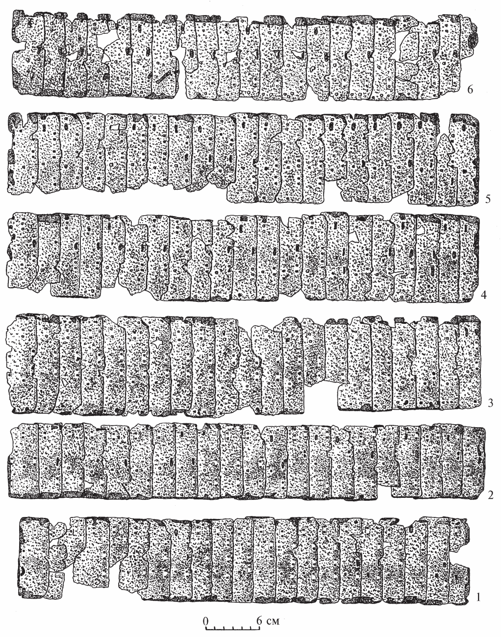6 ряд (рис. 1.-6) состоит из 21 пластины прямоугольной формы. Их длина 8,9-9,27 см, ширина 3,17-3,5 см. 16 пластин снабжены 15 отверстиями (рис. 5.-7): четыре пары боковых, три срединных и две пары окантовочных. Три пластины имеют по 16 отверстий (рис. 5.-6): четыре пары боковых, три срединных и пять окантовочных (пара верхних и три нижних). Две крайние пластины снабжены 17 отверстиями (рис. 5.-5, 8): четыре пары боковых, три срединных и три пары окантовочных (верхняя, нижняя и боковая вдоль верхней части внешней стороны). Общая длина шестого ряда в собранном виде 51,2 см, ширина – 9,5 см. Максимальная ширина верхнего канта 12 мм, нижнего - 9 мм, бокового - 9,3 мм.