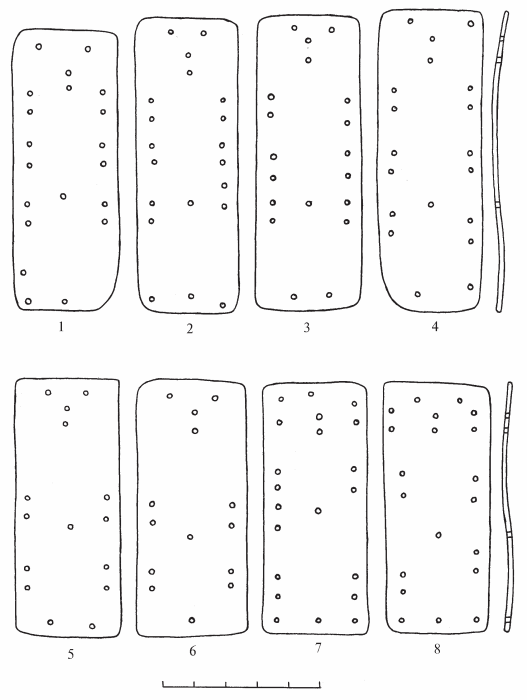 2 ряд (рис. 1 .-2) состоит из 21 пластины прямоугольной формы. Их длина 7,92-8,35 см, ширина 3,1-3,47 см. Четыре пластины имеют по 15 отверстий (рис. 3.-5): четыре пары боковых, три срединных и две пары окантовочных. Восемь пластин снабжены 14 отверстиями (рис. 3.-6): четыре пары боковых, три срединных и три окантовочных (пара верхних и одно нижнее). Одна пластина с 21 отверстием (рис. 3.-7): семь пар боковых, три срединных и четыре окантовочных (одно верхнее и три нижних). Еще восемь пластин с 20 отверстиями (рис. 3.-8): шесть пар боковых, три срединных и пять окантовочных (пара верхних и три нижних). Общая длина второго ряда в собранном виде 52,4 см, ширина - 8,5 см. Максимальная ширина верхнего канта 9 мм, нижнего и бокового - 8 мм.