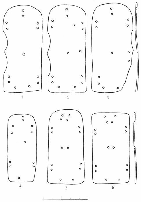5 ряд (рис. 2.-5) состоит из 16 пластин прямоугольной формы. Их длина 7,7-8,4 см, ширина 3,26-4,4 см. 15 пластин снабжены 16 отверстиями (рис. 7.-5, 6): четыре пары боковых, две пары срединных (верхняя и центральная) и две пары окантовочных. Одна пластина имеет 12 отверстий (рис. 7.-4): четыре пары боковых, три срединных и одно окантовочное (нижнее). У двух пластин верхние углы были скруглены, что приближает их по форме к овальнопрямоугольным (рис. 7.-5). Общая длина пятого ряда в собранном виде 54,7 см, ширина –8,5 см. Максимальная ширина верхнего и нижнего канта 12,5 мм, бокового – 8 мм.