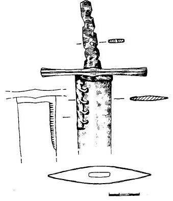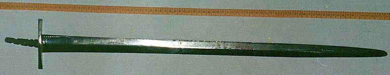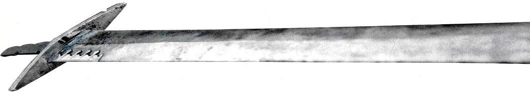 Произведение искусства раннего средневеко­вья, образец высокой технологии своего вре­мени, и притом — наиболее совершенное для той эпохи оружие. Такое сочетание можно встретить лишь в редких образцах. Но этот клинок трудно назвать даже редким. Возможно, он просто единственный. Речь идет о сабле, возраст которой, по заключению экспертов, — 1000-1500 лет. Это один из древнейших вариантов сабли, как таковой, и притом, можно сказать, чудесной сохранности. Известно, что первые сабли появились вслед за созданием седла и железных стремян в середине 1-го тысячелетия нашей эры, как более эффективное, по сравнению с прямым обоюдоострым мечом, клинковое оружие для боя в конном строю. Главные его особенности — рукоять, слегка отогнутая к лезвию и изогнутый клинок. Благодаря этому сабля в момент удара не образует тупого утла с вытянутой рукой, а становится ее прямым продолжением, причем изгиб обеспечивает рубяще-режущее действие: удар получается скользящим и захватывает большую поверхность. Так вот — данный образец относится к самым первым, наиболее древним вариантам сабель. По сути, это даже еще переходная форма, сохранившая ряд признаков прямого обоюдоострого меча, прежде всего – ромбовидное сечение лезвия с хорошо развитыми гранями и толщиной в центре до 5,5 мм. Однако отогнутая рукоятка, а также небольшой изгиб рабочей поверхности лезвия и прогиб его спинки — 4 мм от прямой линии — позволяют классифицировать этот образец как саблю. Общая ее длина — 795 мм, длина лезвия до перекрестия — 717 мм, ширина — 30 мм. Особое впечатление производит эллипсовидной формы перекрестие сабли — очень точной, изящной работы, длиной 105 мм. Такое сочетание внешних форм и пропорций соответствует описанию оружия древних тюрков у известного историка Л.Н.Гумилева в книге «Древние тюрки»: «это сабли с малым изгибом и массивным в сечении ромбовидным клинком». Археолог Алексей Алексеевич Чариков, первым изу­чивший находку, даже не имея о ней никакой предва­рительной информации, уверенно заключил: да, это сабля древних тюрков, сделанная примерно в VI в. н.э (далее все даты относятся к нашей эре). А.А.Чариков много лет работал на раскопках в Западном Алтае и не раз видел подобные клинки (точнее, то, что от них обычно остается) во время раскопок курганов, датиро­ванных по различным признакам именно этим веком — веком выхода тюркских племен «на широкую исто­рическую арену». Но об этом позже. Совершенная в своей простоте, «лаконичная» кон­струкция сабли говорит о ее надежности и предельной функциональности, рассчитанной на многократное боевое применение в отрыве от центров производства, в условиях многомесячных, а зачастую и многолетних походов. Первый же взгляд на это оружие вызвал восхищенный возглас: «какая простая, но мощная работа!». Уникальна и сохранность этого образца, просто невероятная для возраста 1000 - 1500 лет. По мнению археологов, в свое время сабля попала в погребальный костер, ножны и рукоять сгорели, а на поверхности стали образовалась тончайшая оксидная пленка, препятствующая дальнейшему ржавлению. К тому же на протяжении столетии оружие, судя по всему, оставалось в поверхностных горизонтах, не подвергаясь разрушительному действию почвенных солей и кислот. Клинки сходного возраста, найденные в более глубоких слоях, например, в курганах, имеют гораздо ху
