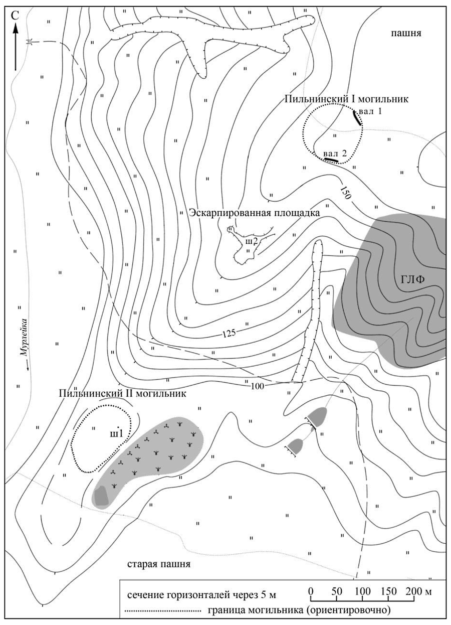 Интересно, что с севера и с юга площадка могильника ограничена двумя валами длиной 35 и 25 м, пересекающими гребень мыса. Ширина валов – 2-2,5 м, высота 0,15-0,20 м. За внешними пределами валов грабительских вкопов не зафиксировано.