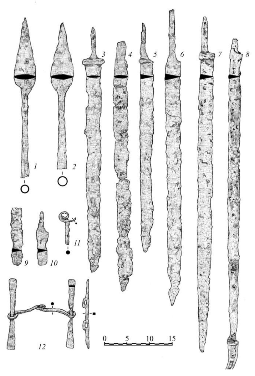 Копья представлены двумя экземплярами. Наконечники с широколезвийным пером, наибольшее расширение которых приходится на нижнюю треть, с длинной втулкой, превышающей длину пера (рис. 5-1, 2). Перо наконечников имеет выраженное осевое ребро. Подобные наконечники копий встречаются в материалах Андреевского [30, табл. 42-3-6; 12, рис. 24-1] и Староардатовского [12, рис. 33-1, 2] курганов пьяноборской культуры [1, табл. 16-9; 5, рис. 15-19]. Близкие, с длинной втулкой, но более узким пером, имеются как в указанных, так и в других памятниках пи-серальско-андреевского типа (Писеральский и Климкинский курганные могильники).