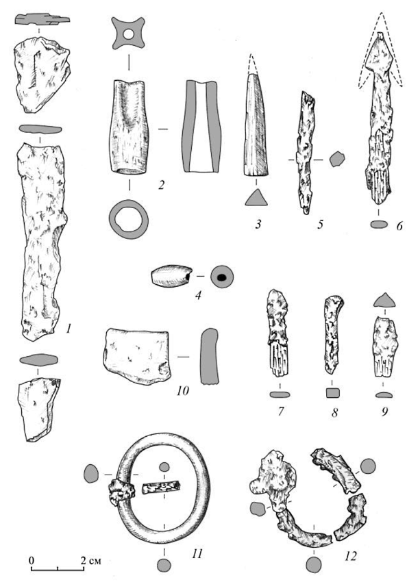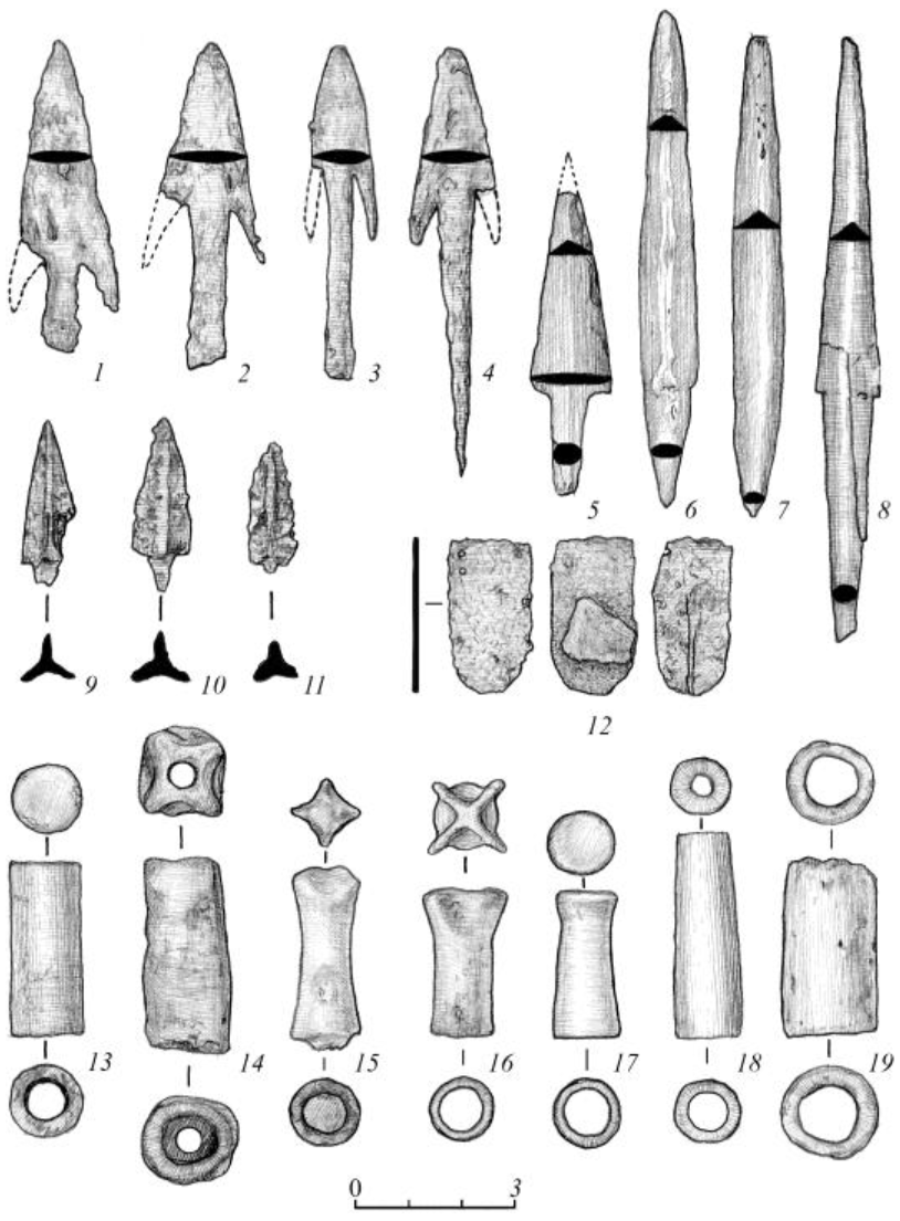 Костяные наконечники стрел представлены, в основном, черешковыми трехгранными образцами с упором для древка и без такового. Подобные наконечники широко представлены в памятниках писеральско-андреевского типа. Интересно отметить, что трехгранные костяные наконечники Андреевского кургана составляли 94% от всех костяных и 46,4% от всех наконечников стрел [12, с. 20].