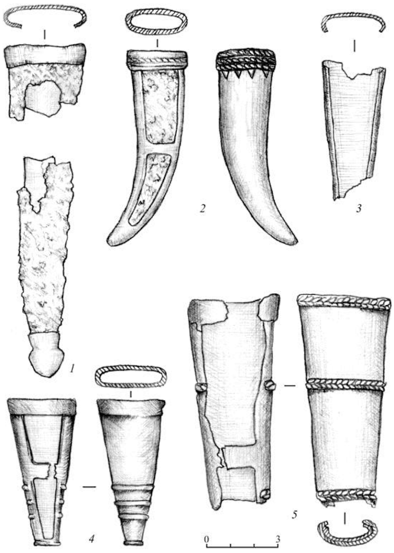 В пильнинской коллекции присутствуют бронзовые наконечники ножен клинкового оружия (3 экз.). Первый из них украшал конец ножен палаша и представляет собой удлиненно-коническое изделие выгнутой формы, овальной в поперечном сечении. Этот наконечник ножен очень напоминает клык животного (рис. 7-2).
