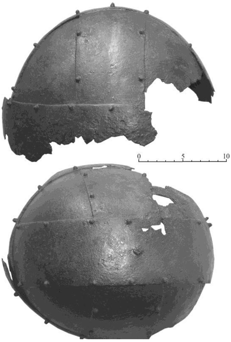 Защитное вооружение, крайне редкое в любом из могильников раннего железного века и раннего средневековья на территории Восточной Европы, представлено двумя шлемами (один из них крайне плохой сохранности), фрагментами кольчужного плетения (кольчужный доспех) и пластинами-чешуйками доспеха или бармицы (рис. 6-12). Первый железный шлем (рис. 8) состоит из двух перпендикулярных широких полос, укрепленных на такой же широкой полосе оголовья. Сектора заклепаны сегментовидными пластинами, уложенными изнутри. Заклепки тонкие, имеют гранение, сильно профилированный вид снаружи. Можно с уверенностью сказать, что пильнинский шлем подобной конструкции относится к наиболее ранним образцам типа «Шпангенхельм». Второй шлем, судя по сохранившимся фрагментам, был собран из узких продолговатых пластин, шириной до 2 см, скрепленных между собой заклепками и сведенных под круглую пластину-навершие.