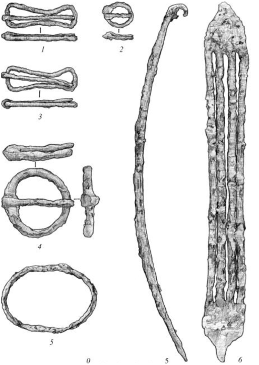 Бронзовые пряжки двух ведущих типов - круглые и прямоугольные вытянутые, с подвижным бронзовым язычком. Интересно отметить практически полную аналогию пильнинской бронзовой пряжки с двужильным язычком (рис. 10-1) с образцом из Андреевского кургана (погр. 56), которая отличалась только тем, что ее лицевая поверхность была украшена насечками [30, табл. 35-6; 12, рис. 25-9], а пильнинская – гладкая. Две крупные застежки с неподвижным крючком (рис. 10-6, 7) имеют прототипы в пьяноборской культуре по облику и конструкции [1, табл. 11-44-46]. Железные пряжки с круглой (рис. 9-2, 4) и прямоугольной рамкой с прогнутыми длинными сторонами (рис. 9-1, 3) довольно широко распространены во времени и по территории. Особый интерес представляет крупная железная четырехжильная застежка с неподвижным крючком (рис. 9-6). Такие застежки с разным количеством жгутов были найдены в погребении 50 Андреевского кургана (6 жгутов) [30, табл. 26-12], погребении 10 кургана 2 Писеральского могильника (8 жгутов) [33, табл. XXIV-10].