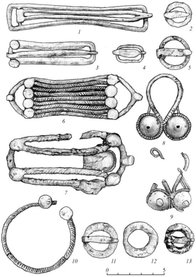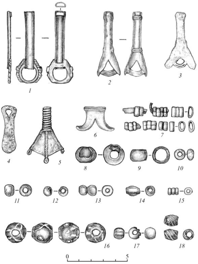 Предметы конского снаряжения представлены двусоставными железными удилами с уплощенными стержневидными псалиями, имеющими по два боковых выступа-петли с отверстиями (рис. 5-12). Псалии от петель раскованы до удлиненно-треугольной формы с прямо обрубленными концами. Аналогичные [1, табл. 14-27] и близкие по конструкции псалии с двумя выступами-петлями встречаются в памятниках сарматского мира, пьяноборской [1, табл. 14-21, 24] и кара-абызской [24, рис. 13-13] культур, в материалах Андреевского кургана [12, рис. 22-1-8], Писеральского и Климкинского могильников [16, рис. 7-4, 6].