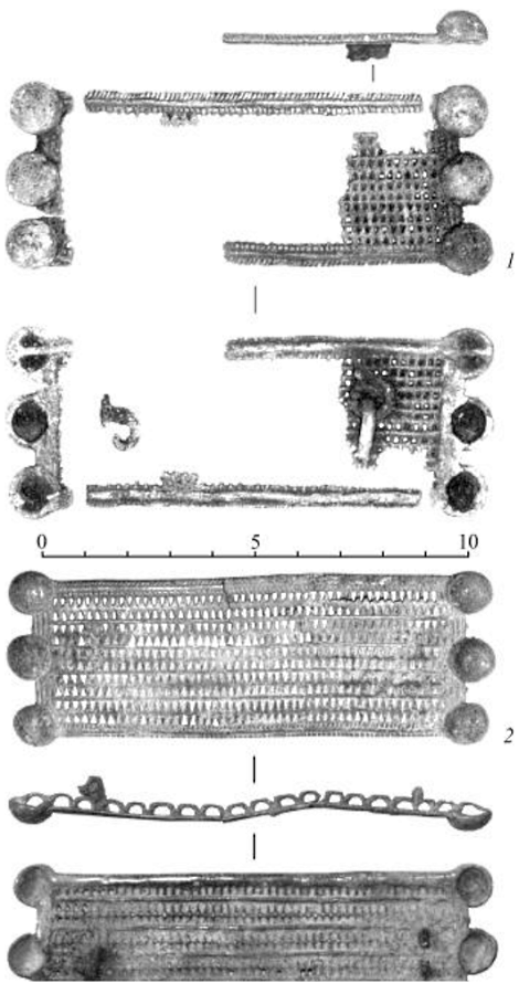 Две практически идентичные крупные бронзовые прямоугольные броши, украшенные прорезным треугольным орнаментом, образующим 5 рядов ромбов с тремя сферическими выступами на коротких сторонах, представлены в коллекции Пильнинского могильника (рис. 11-1,2].