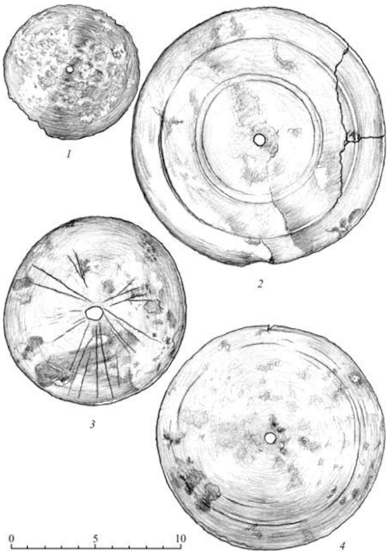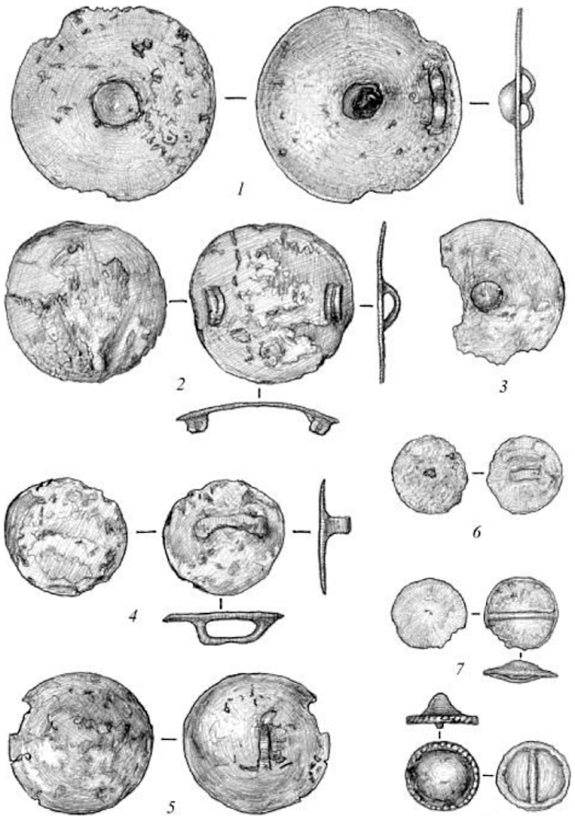 Пояса и одежда украшались бронзовыми подвесками различных типов и нашивками (рис. 12-1-6). Большое количество различных по размеру и элементам крепления круглых блях и бляшек, которые использовались в декорировании одежды, поясов, ножен клинкового оружия (рис. 14-1-8). В коллекции присутствуют три крупные бляхи (рис. 13-2-4) (диаметр 10-12 см) из так называемых «сарматских» зеркал, нередко украшенных циркульным орнаментом и шестилепестковой розеткой. Огромное количество этих зеркал на протяжении долгого времени (III в. до н.э. - III в. н.э.) оседало в могильниках как кочевого сарматского населения, так и оседлого населения лесных и лесостепных культур. Можно предположить, что эти зеркала изготовлялись в ремесленных центрах Средней Азии для торговли с кочевниками, через которых зеркала попадали к племенам кара-абызской и пьяноборской культур и использовались этим населением в виде украшений поясов, одежды и оружия [19, с. 103].