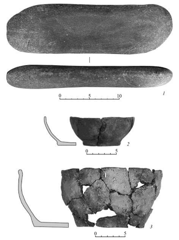 На низком мысообразном отроге второй надлуговой террасы, в 200 м от мыса, на котором расположены могильник и эскарпированная площадка, был найден на поверхности железный меч (вероятно, изъятый грабителями из разрушенного ими погребения и выброшенный из-за плохого состояния) линзовидного сечения со слабо выраженным черешком (рис. 5-4). Поблизости от места нахождения меча был заложен рекогносцировочный шурф первоначальными размерами 1x2 м. В дальнейшем он был увеличен до 2х4 м. Судя по керамическому материалу и пищевым остаткам (костям животных), на этом месте располагалось русское поселение эпохи позднего средневековья (ориентировочно XV-XVI вв.).