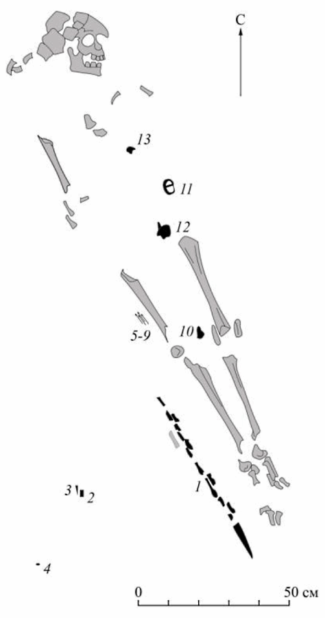 Интересно, что в шурфе было выявлено мужское захоронение (35-40 лет) (рис. 16), погребальный инвентарь которого можно соотнести с материалами писеральско-андреевского типа памятников и датировать I-III вв. н.э. (рис. 17-1-12). Это костяные и железные наконечники стрел, бронзовая пряжка с железным язычком, округло-вытянутая бусина глухого серебристого цвета. Вдоль правого бедра лежал железный меч плохой сохранности. Собственно, и сохранность костей захороненного тоже плохая. И это понятно, поскольку умерший был погребен на глубине 25-26 см от поверхности.