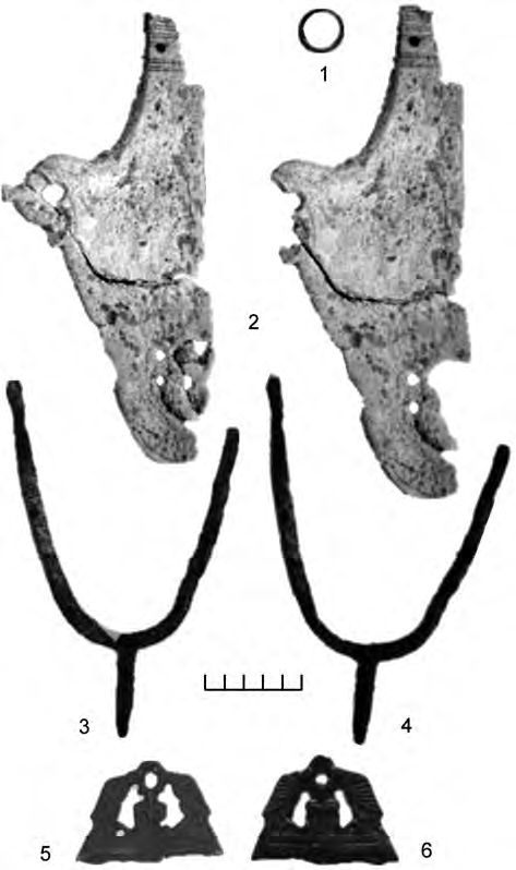 С «позднехазарской» или «венгерской» школой художественной металлообработки связана подвеска, сделанная из наременного наконечника (рис. 2: 10). Ее размеры: 18 х 15 мм, ушко из серебряной в два каннелюра полоски на двух серебряных заклепках. Орнаментация украшения, представленная растительным сюжетом («лотос с крином»), находит соответствия в поясных бляшках класса XXVI (Мурашева 2000: 44, 91-99). Ближайшей аналогией этой подвеске могут служить бляшка и наконечник, также с приклепанными ушками, из камерного погребения № 49 (раскопки 1999 г. на территории Михайловского монастыря в Киеве), датирующегося третьей четвертью X в. (1вакш, Козюба 2003: 42, рис. 6: 4).