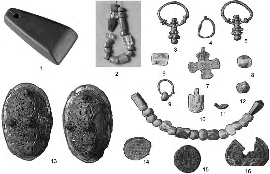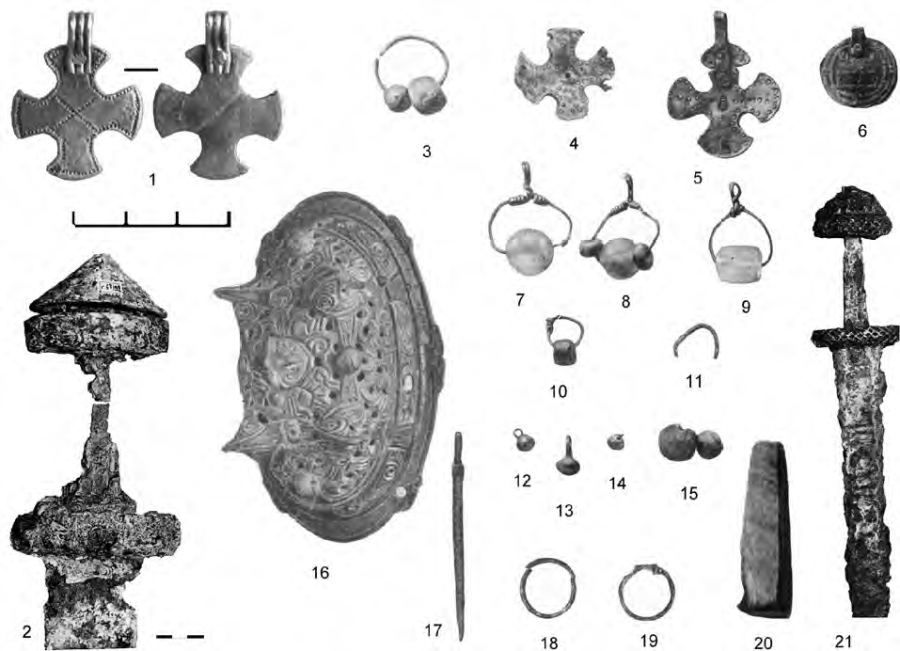 Возвращаясь к крестовидным подвескам данного комплекса, следует заметить, что двойной их учет с якобы утраченными экземплярами погребения № 117 (Недошивина 1983: 222; Мусин 2002: 130), является недоразумением, как и разбивка М.К. Каргером всего погребального комплекса на два отдельных захоронения. В типологическом отношении подвески погребений № 124 и 117/125 входят в совокупность крестов из листового серебра с пуансонным орнаментом, выделенных Й. Штекером в тип 1.2.2, – крест в условном круге, с расширяющимися округленными окончаниями лопастей. Исходная форма данного типа была обязана золотым крестовидным подвескам и фибулам, выполненным в стиле «полихромной инкрустации», а также фибулам из листового, покрытого штампованным орнаментом серебра, которые бытовали в христианской среде второй половины VII-IX вв. на территории от Британских островов до Франкских королевств (Staeсker 1999: 91-94, Abb. 20-27). А.Е. Мусин вводит в круг ранних прототипов («стадиальных аналогий») крестовидных подвесок Северной и Восточной Европы и кресты из листового золота, нашивавшиеся на погребальный саван франконской, алеманской и лангобардской знати периода массовой христианизации их королевств в VI-VII вв. (Мусин 2002: 143, рис. 53-55). Однако, в согласии со строгой типологией, эти нашивки объединяют равноконечные кресты, как с прямыми ветвями (типы 1.1.1., 1.2.1. по Й. Штекеру), так и с расширяющимися окончаниями, которые вписываются в условную окружность.