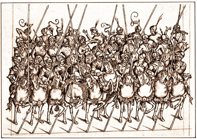 рыцариВоенные институты Бургундии были основаны на принципах вассальной присяги и феодального права. В случае войны объявлялась мобилизация феодального ополчения тех или иных провинций княжества, сбор городской милиции и наемных контингентов.