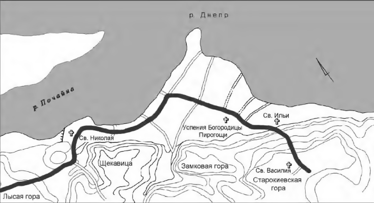 Город начал формироваться вдоль главной улицы, которая тянулась параллельно береговой линии. Концы улицы, как показывают новейшие исследования, упирались в возвышенности и выходили к двум древнейшим подъемам (узвозам), ведущим в Верхний город. Это обстоятельство, на наш взгляд, может служить подтверждением тезиса о связи населения Подола с курганами Верхнего города. Итак, дорога, вдоль которой начала формироваться первая застройка Подола, выводила к ранним городским некрополям: южное направление дороги – к Некрополю-I на Старокиевской горе, северное направление – сначала к подножью Кирилловских высот, а дальше на верхнее плато, где располагалась хорошо знакомая исследователям исторической топографии местность – Лысая гора, где еще в конце Х!Х в. была выявлена и изучена группа ранних курганных погребений – Некрополь II (Sahajdak 2007: 114).