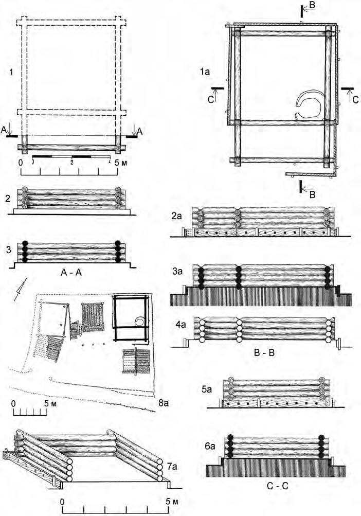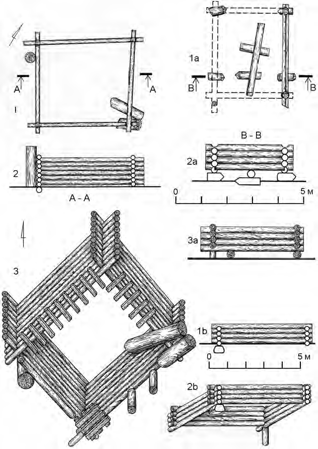 Для обустройства земляных площадок использовали круглые колоды, подобные тем, которые шли на строительство стен сруба, а иногда и конструктивные детали верхних частей. Еще один способ подготовить платформу для установки сруба состоял в том, что земля удерживалась конструкцией, сделанной из плетня, возвышавшегося над дневной поверхностью на 20-30 см (рис. 3: 1, 3). Тщательная подготовка земляной платформы производилась, как правило, под главной срубной постройкой усадьбы, которая служила жилищем, вспомогательные же постройки, служившие для хранения товаров, ставились прямо на землю.