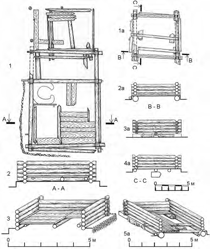 Тип вертикальных фундаментных опор использовался для построек, предназначавшихся для хранения товаров. Так называемые «стулья» изготавливались из обрезанных колод, которые тоже ставились как под блоки угла, так и под стены. Для подкладок делалось специальное углубление в землю. В отдельных случаях северный угол сруба опирался на вертикально поставленную опору, а противоположный – на камень (рис. 4: 1b, 2b).