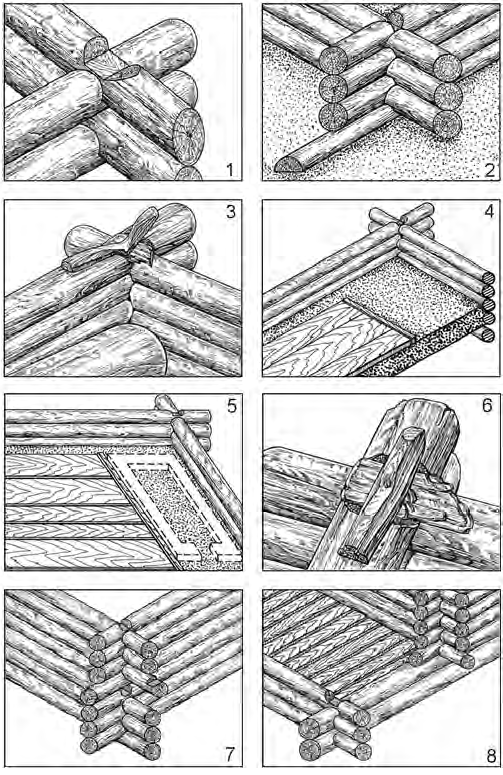 Основная масса срубов Подола построена в технике рубки «в обло» с чашкой в нижележащей колоде (рис. 5: 1, 2). Точность изготовления «чашки» в решающей степени влияла на качество стен, основными требованиями к которым были плотность прилегания и устойчивость. Случаи досадных ошибок, когда одна из вырубок оказывалась слишком заглублена, исправлялись вкладыванием в чашку крест-накрест двух деревянных пластин, скрепленных между собой и колодой деревянным шпунтом (рис. 5: 3, 4). Устойчивость увеличивали за счет простого приема: края нижних венцов не обрубались (рис. 5: 2).