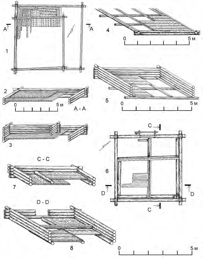 Основная часть жилых построек имела полы, которые были сделаны из колотых довольно широких досок. Обычная ширина их составляет 20-40 см, толщина 4-5 см. В одних случаях полы прямо укладывались на земляную подсыпку (рис. 5: 5, 6). Половицы плотно подгонялись друг к другу, раскреплялись брусками и крепились при помощи деревянных колышков. Чаще пол настилался на лагах – переводинах. Сами лаги укладывались непосредственно на землю, в одних случаях, не скрепляясь со стенами (рис. 6: 6), либо врубались в венцы постройки (рис. 6: 6, 8). Глухая врубка встречается чаще, чем сквозная. Лаги иногда делили пространство внутри постройки на большую и меньшую части, соответственно использовались длинные и короткие доски. В квадратных в плане постройках лага укладывалась так, что разделяла их на две равные части. В переводинах выбирался продольный паз на высоту, соответствующую толщине края закладываемой доски. Иногда паз выбран только с одной стороны лаги. В подольских постройках встречена более архаичная форма укладки – без механической связи между полом и стеной (пол настилался прямо на землю), и развитая – пол был связан со стеной через половицы, которые крепились изнутри стены. Обычно лаги врубались в пазы в нижних венцах срубов. Доски пола, таким образом, оказывались между первым и вторым венцами стен. Наиболее совершенной была конструкция, примененная строителями сруба № 8 на участке Красная площадь (рис. 6: 4, 5). Половицы сруба были уложены параллельно длинной стене и крепились через вырубки, выходя за наружную часть стены под нижним венцом бревен стены. Доски пола, уложенные на лаги-половицы, также оказывались между первым и вторым венцами. Так создавалась прочная связь между полом и стенами, что эффективно сказывалось на эксплуатационных свойствах постройки.