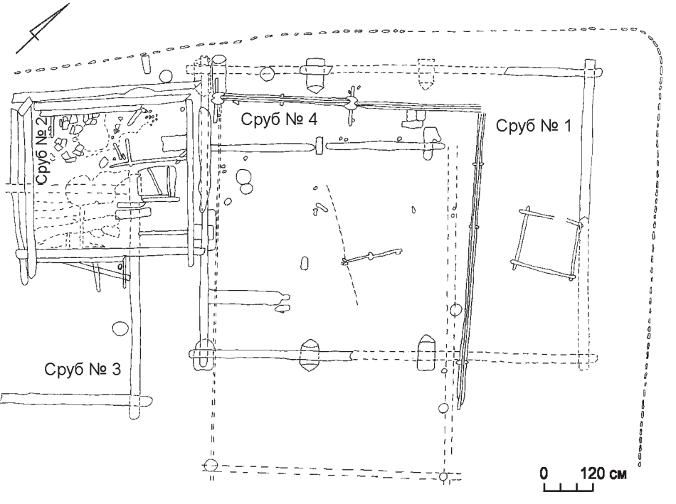 Иногда большая подкладка дополнялась меньшей, установленной сверху, также имевшей паз для соединения с бревном сруба. В срубе № 2 была зафиксирована подкладка, уложенная под угловой блок, состоящая, как минимум, из 5-ти деревянных элементов, уложенных один на другой. Тут же была обнаружена отдельно стоящая подкладка. Характер вырубки паза в ее верхней части показывал, что к ней крепилась доска, установленная на ребро.