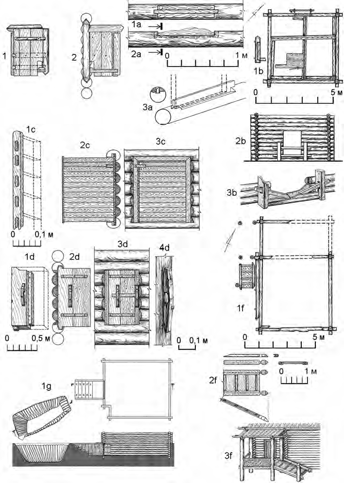 В тех случаях, когда жилое пространство сруба было поднято на уровень четвертого венца и выше, применялась более сложная конструкция порога. Он мог состоять из настила, выполненного перед дверью на всю ширину стенки сеней. Вертикально вкопанные столбы служили опорой для порога и одновременно навеса над ним. К порогу примыкала деревянная лестница, упиравшаяся другим концом в землю. В срубе № 13, исследовавшемся на Житнеторгской площади, судя по наклону лестничного пандуса, дверь могла располагаться на высоте от 1,3 до 1,5 м. Здесь, при помощи целой системы вертикально вкопанных столбов у восточного фасада постройки, была устроена развитая галерея, примыкавшая к срубу с севера. Основой лестницы (места, где она упиралась в землю) служило горизонтально лежащее толстое бревно, которое фиксировалось деревянными кольями, вбитыми в землю. Крепление плоскости лестницы в бревне осуществлялось через два гнезда, куда вставлялись торцы брусьев, образующих наклонную плоскость от настила на уровне дверного проема по направлению к земле (рис 7: 1f, 2f).
