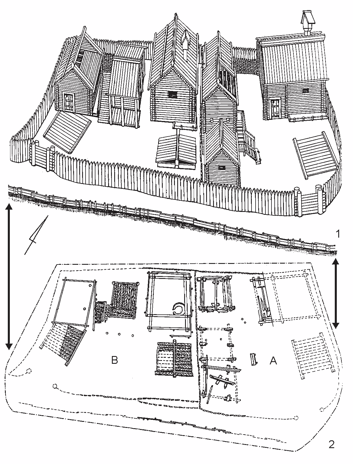 На Житнеторгской площади Подола, располагавшейся у самого подножья Замковой горы, были раскопаны остатки целого городского квартала, состоявшего из усадеб, которые были обозначены буквами А, В и С. Наиболее полно была изучена усадьба В, жизнь на которой прослеживается на трех горизонтах бытования общей хронологией в 129 лет (887-1116 гг.). Границы усадьбы практически не изменились, как и площадь, которая составила 375 м2. С трех сторон усадьба соседствовала с примыкающими к ней аналогичными усадьбами, а юго-восточной стороной примыкала к ручью, протекавшему в сторону Днепра из Кожемяцкого и Глубочицкого оврагов. Она представляла собой типичную для Подола усадьбу, в которой отразились наиболее характерные черты гражданского строительства Х-ХІ вв. Постройки, а их вместе с погребом насчитывалось четыре, размещались по периметру усадьбы. Жилой сруб располагался в северном углу усадьбы, примыкая к забору. Ворота находились в южном углу усадьбы, по диагонали от жилища. Въезд на усадьбу был устроен в виде настила на двух параллельных лагах, заканчивавшегося у входа в большую срубную постройку, которая располагалась в западном углу усадьбы напротив ворот. Центральная часть усадьбы оставалась свободной от застройки и представляла открытый двор. С юго-западной стороны усадьба соседствовала с усадьбой А, чуть меньшей по площади. С юга ее естественной границей служила береговая линия небольшой речки, с северо-запада и юго- запада она была ограждена заборами. Назначение построек на усадьбе показывает, что прилегающая к ручью часть усадьбы выполняла парадную функцию (чистый или «белый» двор), а другая – хозяйственную функцию. В результате археологических исследований ученые получили возможность осуществить архитектурную реконструкцию изучаемых памятников (рис. 10) (Sagaydak 2006: 2775).