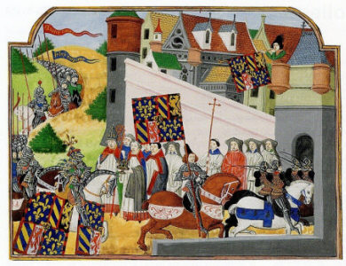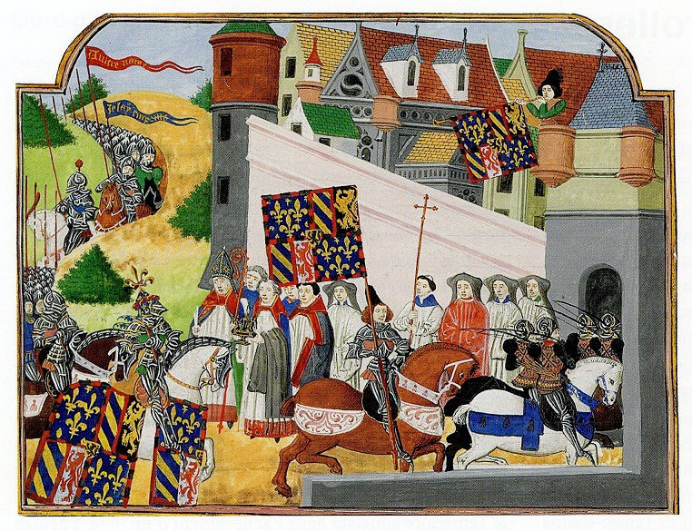 | Армия Филиппа Доброго вступает в Гент. Миниатюра из «Хроник царствования Карла VII» Жана Шартье, 1479 г. Национальная библиотека Франции, Париж. |