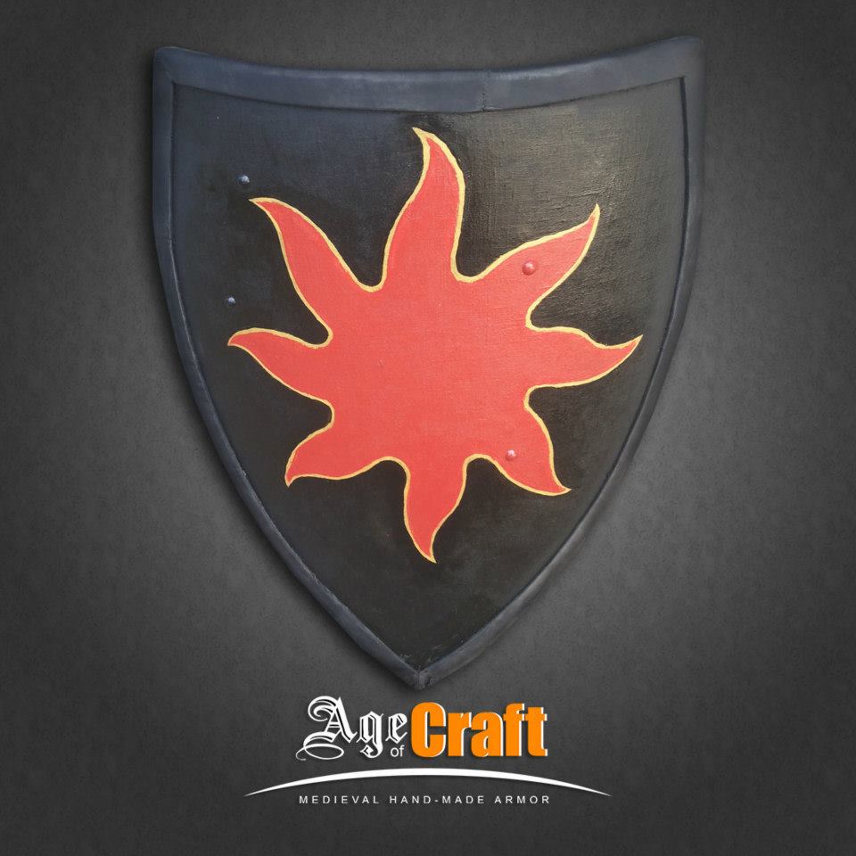К 13 веку по мере совершенствования доспехов роль упала и он стал уменьшаться и упрощаться - пропал умбон, окантовка по краям стала применяться реже. Тут наша компания представляет геральдический треугольный щит из двух склееных фанерных листов, покрытые мешковиной, окрашенные. Окантовка может быть кожаной или железной.Герб по вашему экскизу. Размер 60 x 56 см. Внутреннюю имитацию деревянных досок также выполняем.