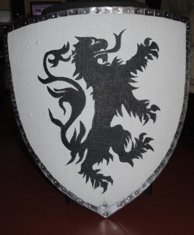 К 13 веку по мере совершенствования доспехов роль упала и он стал уменьшаться и упрощаться - пропал умбон, окантовка по краям стала применяться реже. Тут наша компания представляет геральдический треугольный щит из двух склееных фанерных листов, покрытые мешковиной, окрашенные. Окантовка может быть кожаной или железной.Герб по вашему экскизу. Размер 60 x 56 см. Внутреннюю имитацию деревянных досок также выполняем.